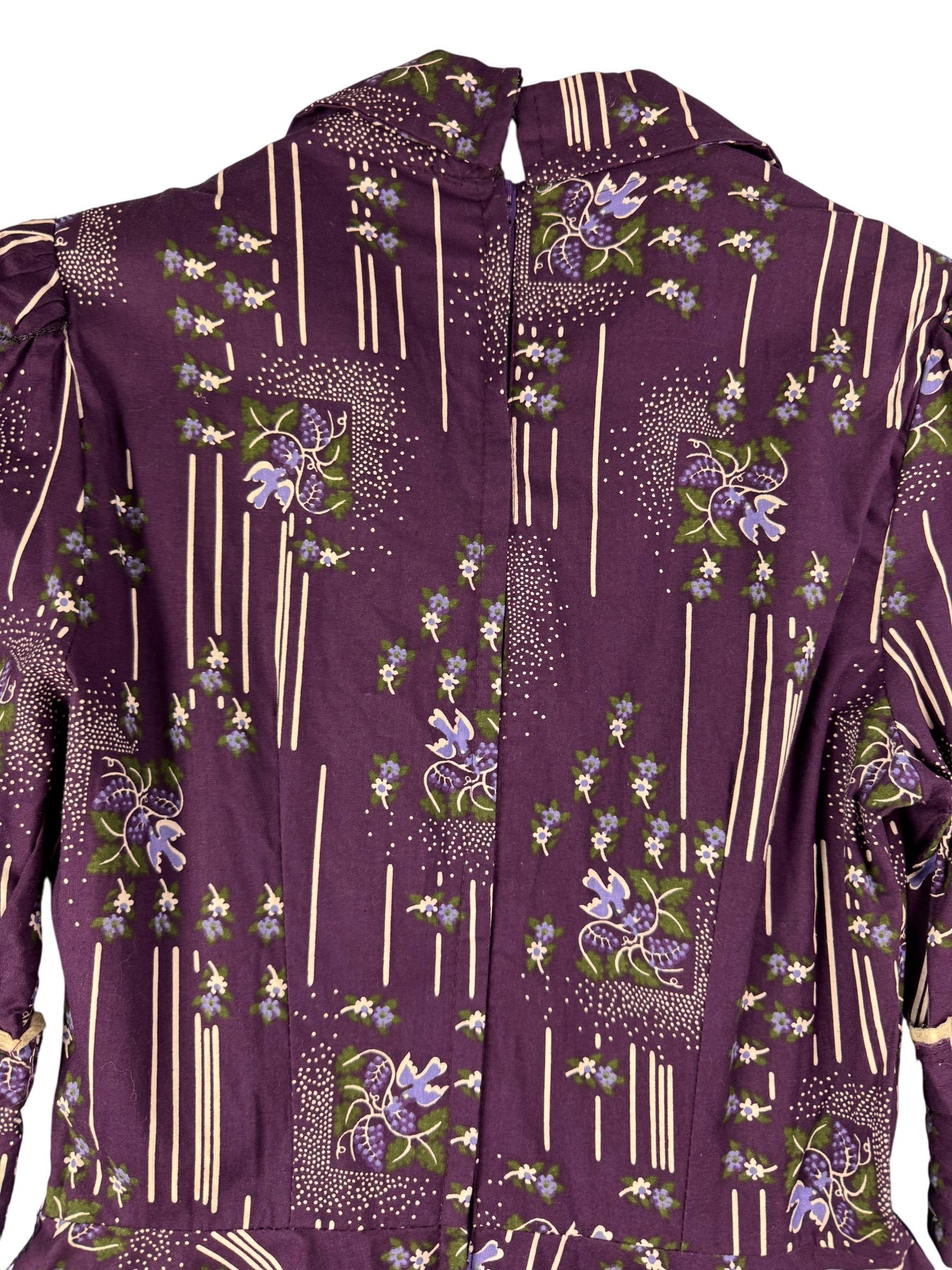 Vintage 1960s dress with a striking purple floral pattern. Features a collared neckline and button-up front with three-quarter sleeves. Made in England, highlighting its authentic retro style.