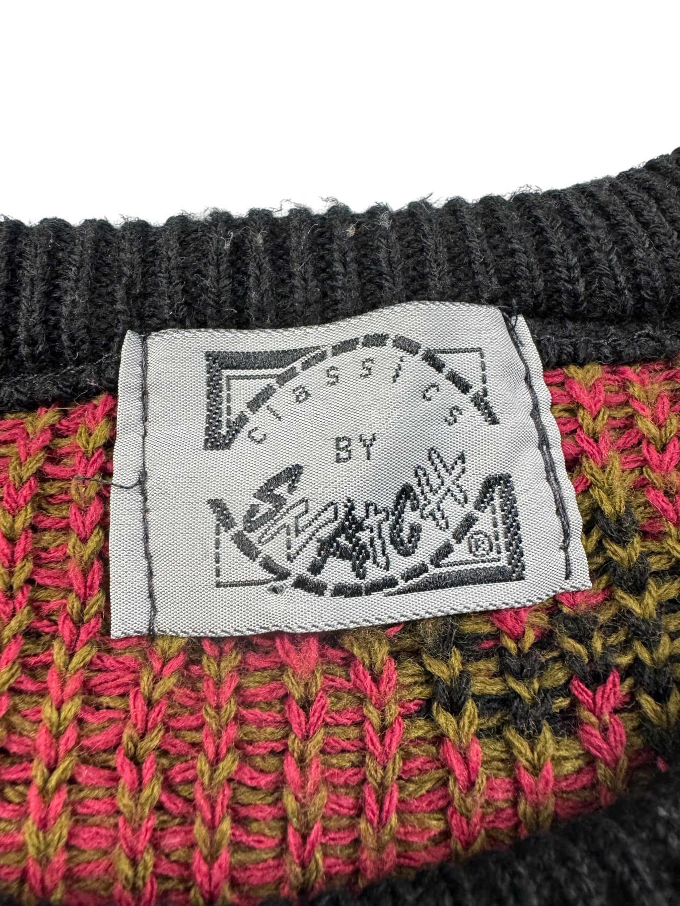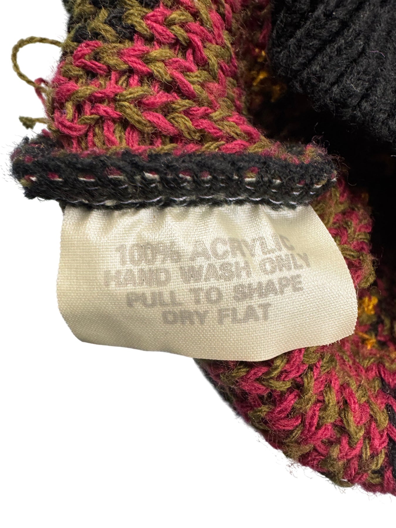 100% acrylic material with a floral pattern design. Crew neckline and ribbed cuffs and hem for a snug fit. Label indicates hand wash only and dry flat.