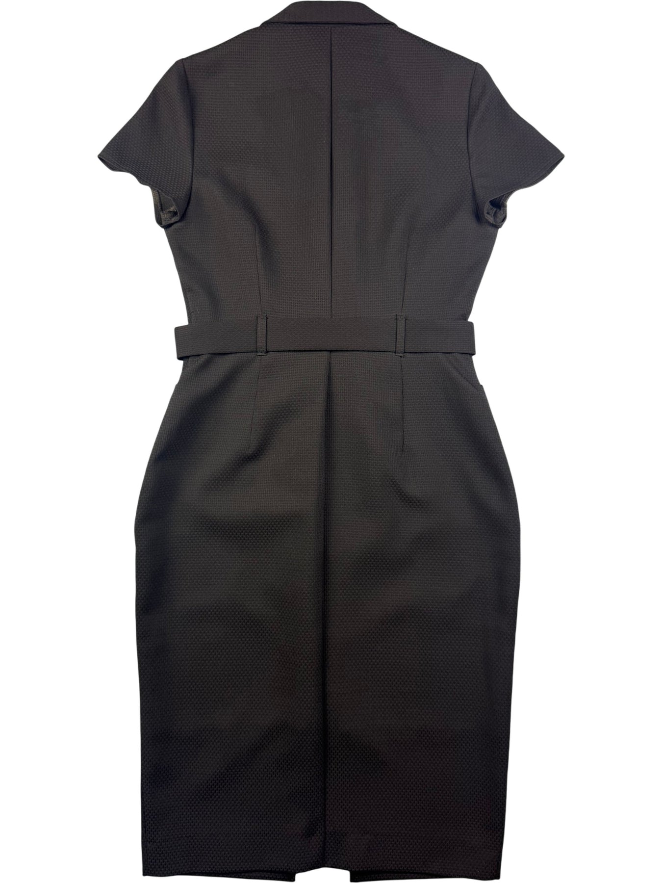Black short-sleeve dress with a zip front and belted waist. Features two front pockets with button closures and a textured fabric. Made from a blend of materials for durability.