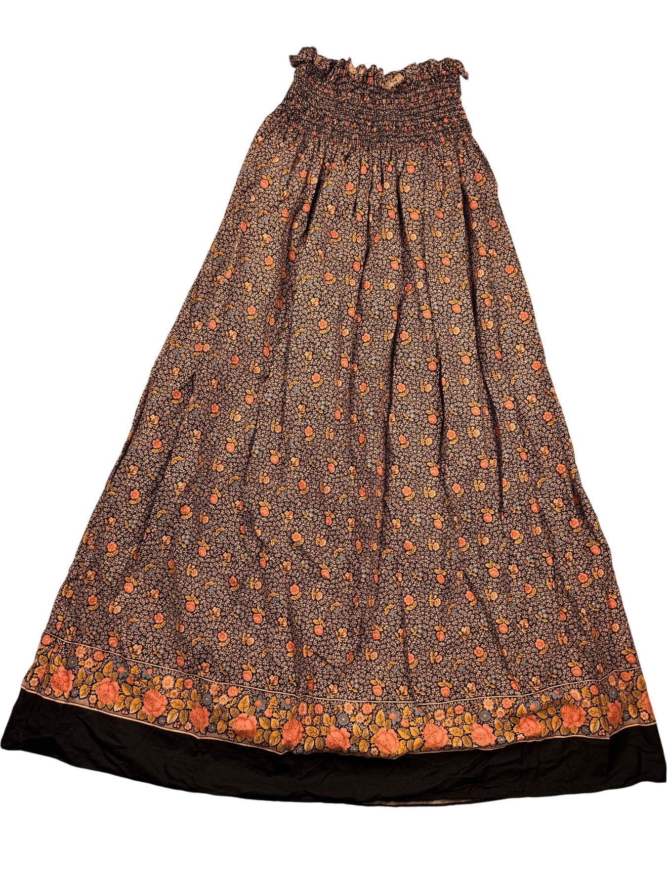 Full-length strapless dress with an elastic smocked neckline for comfort. Features a floral pattern throughout and a contrasting border. Made from 100% cotton for a breathable feel.