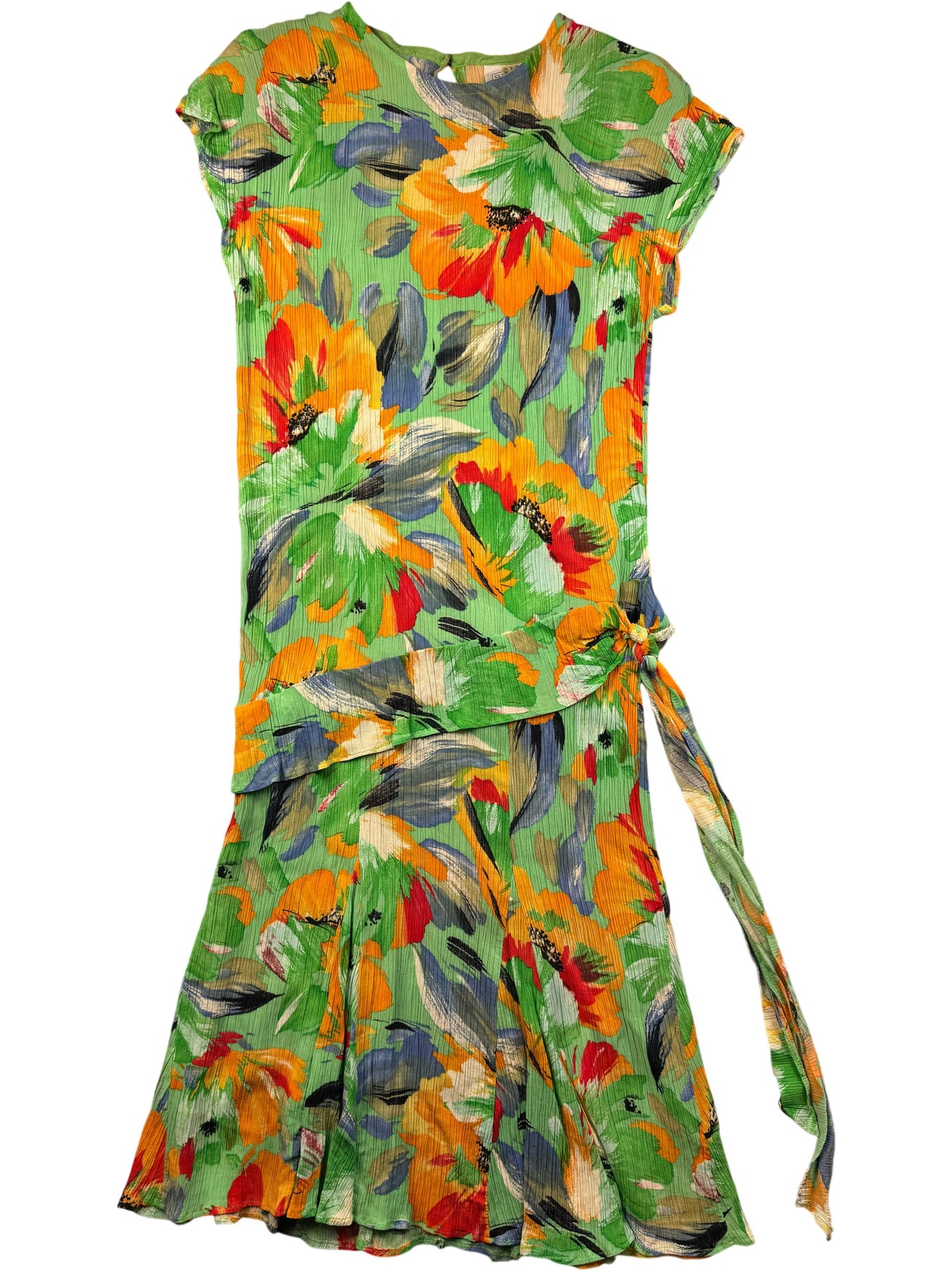 Colourful floral pattern dress with cap sleeves and pleated design. Features a tie waist for an adjustable fit and mid-calf length.