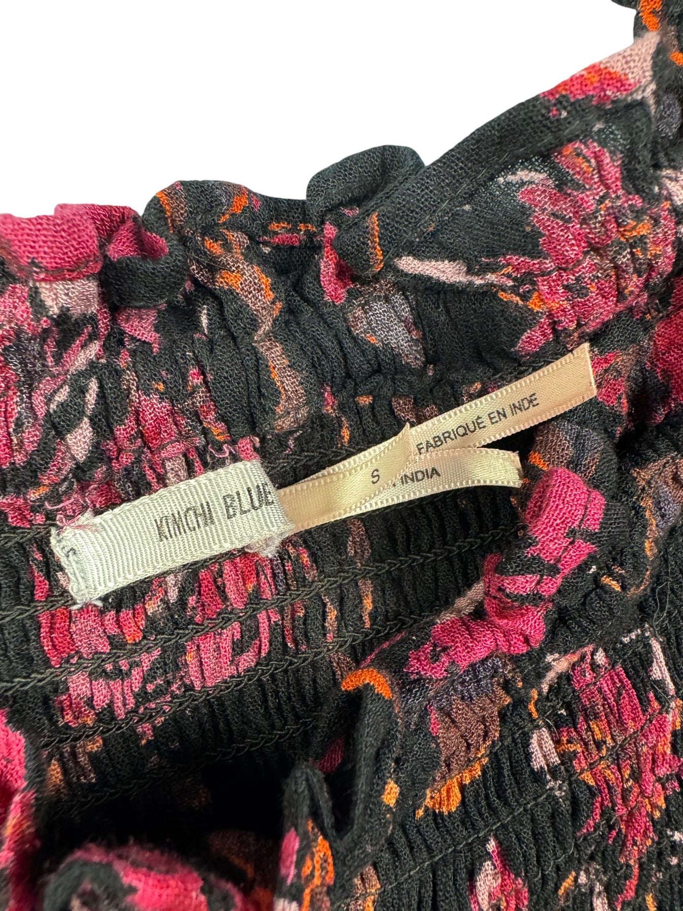 Features a floral pattern in pink and orange on a dark background. Off-shoulder design with ruffle detailing. Made from 100% viscose.