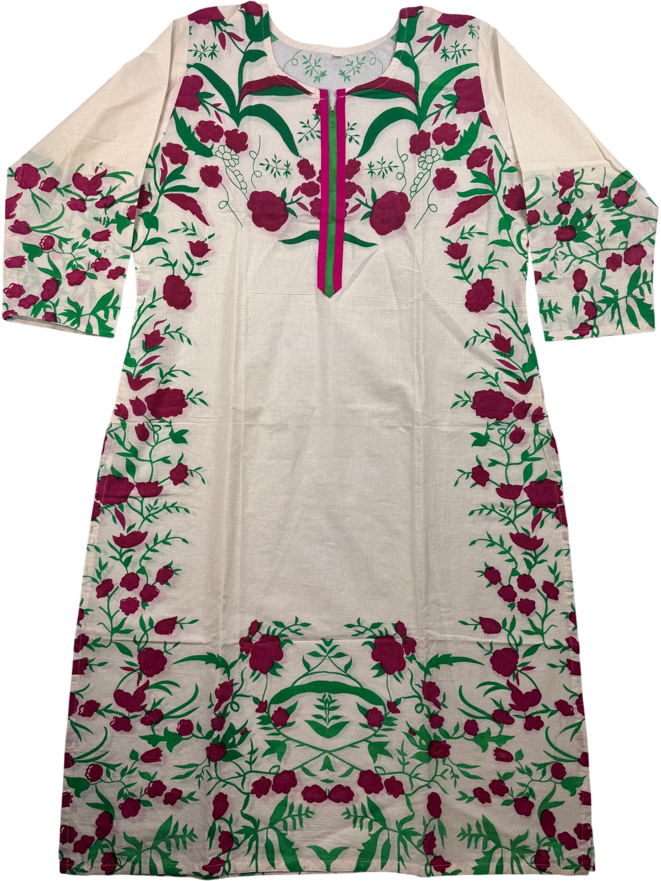Vintage Cream Indian dress featuring a vibrant floral pattern with green and maroon hues. Designed with long sleeves and a round neckline. Made from lightweight fabric for a comfortable fit.