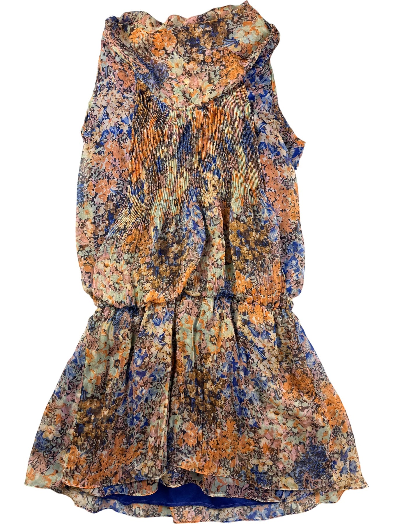 Sleeveless floral dress with pleated details and elastic waist. Features a vibrant multicolour pattern with a blue inner lining.