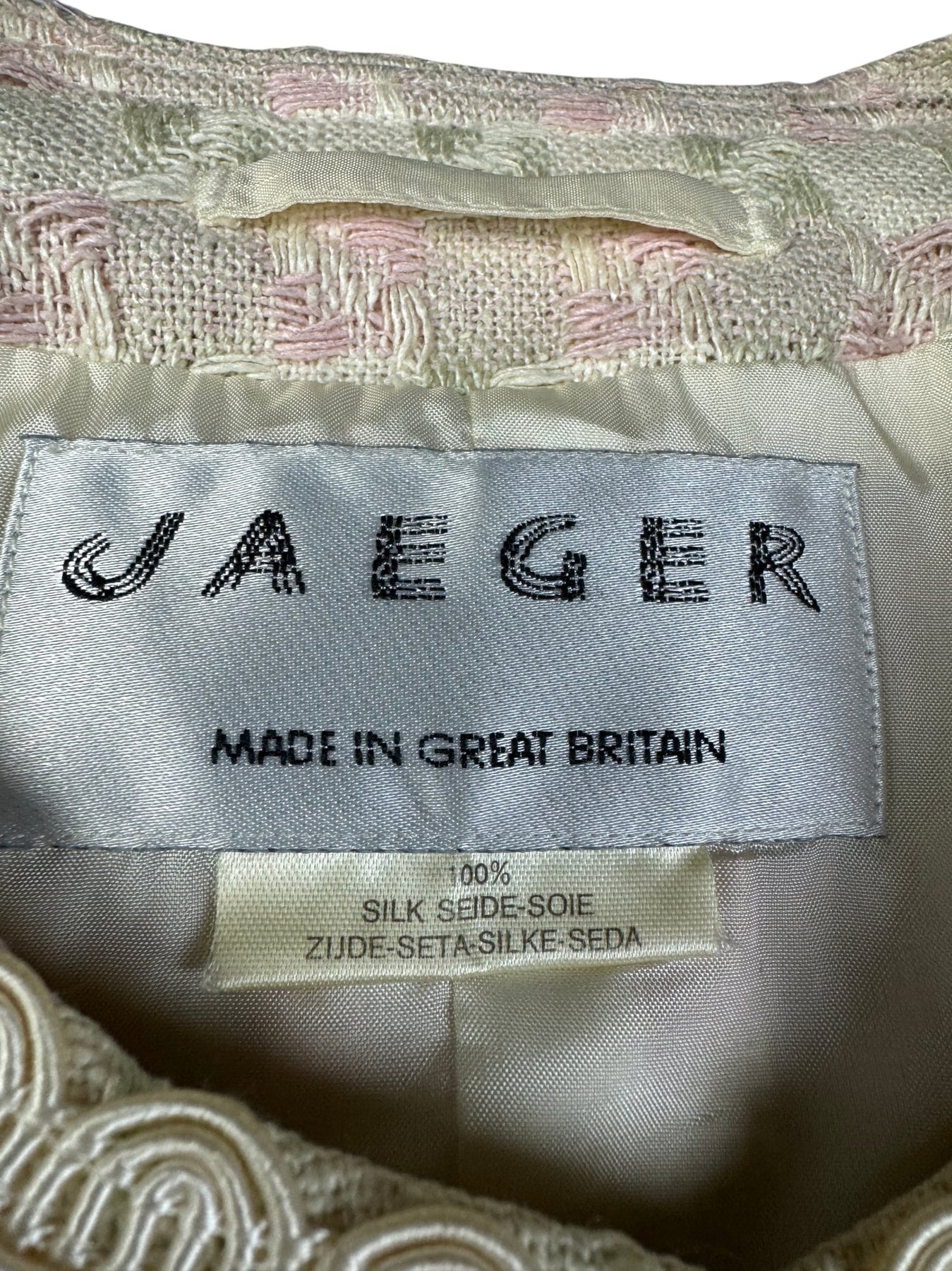 This Jaeger skirt suit is made from 100% silk and features a pink patterned design. The suit includes a button-up jacket with decorative trim and flap pockets. It is made in Great Britain and ensures a classic, elegant look.