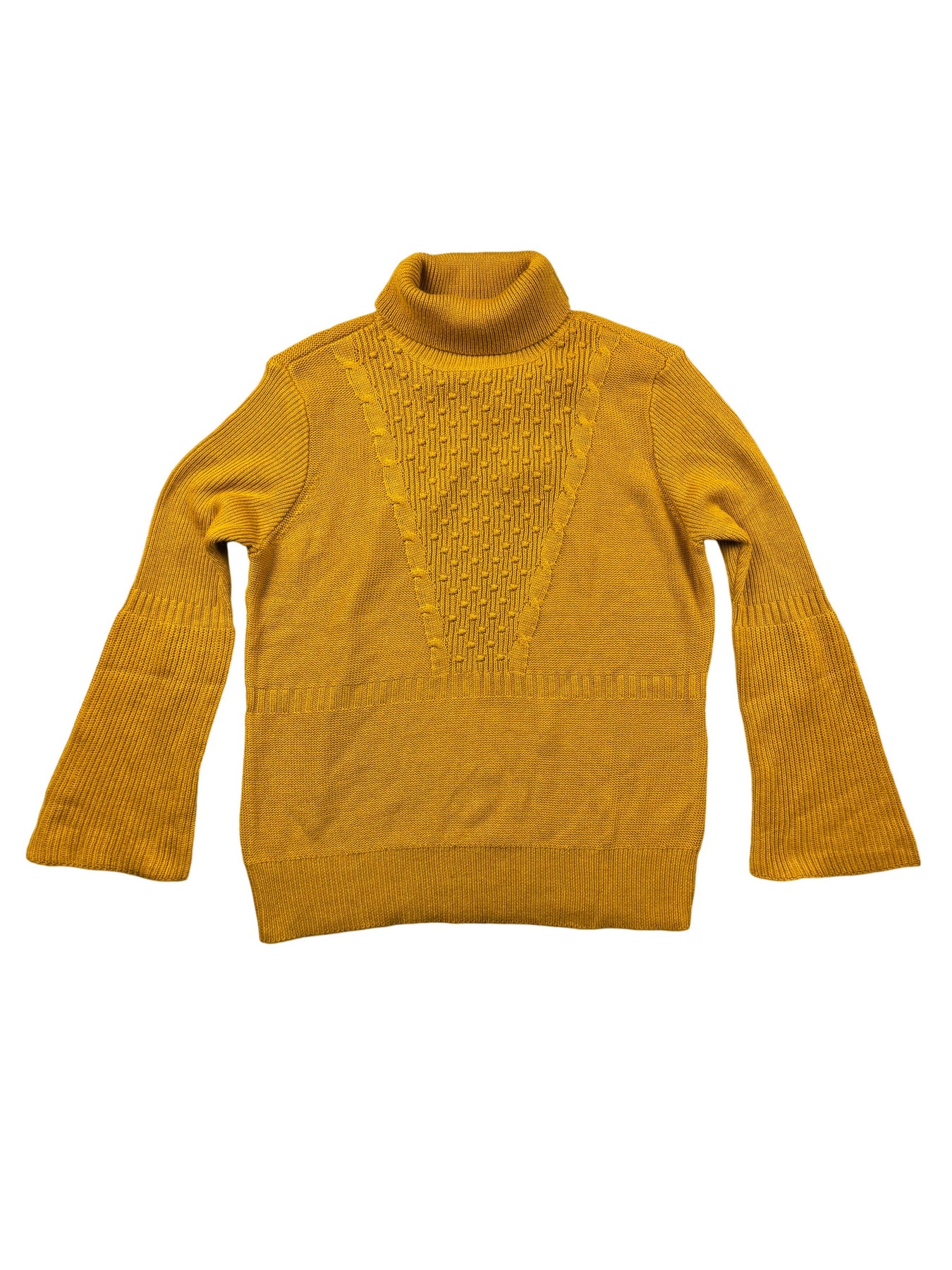 Mustard roll neck sweater with textured knit design. Made of 50% polyester, 20% acrylic, 20% polyamide, and 10% wool. Features long sleeves with ribbed cuffs.