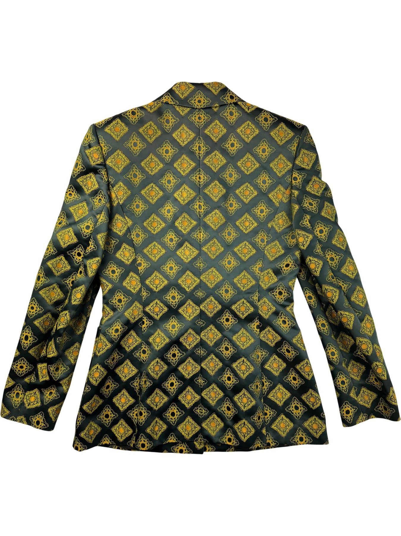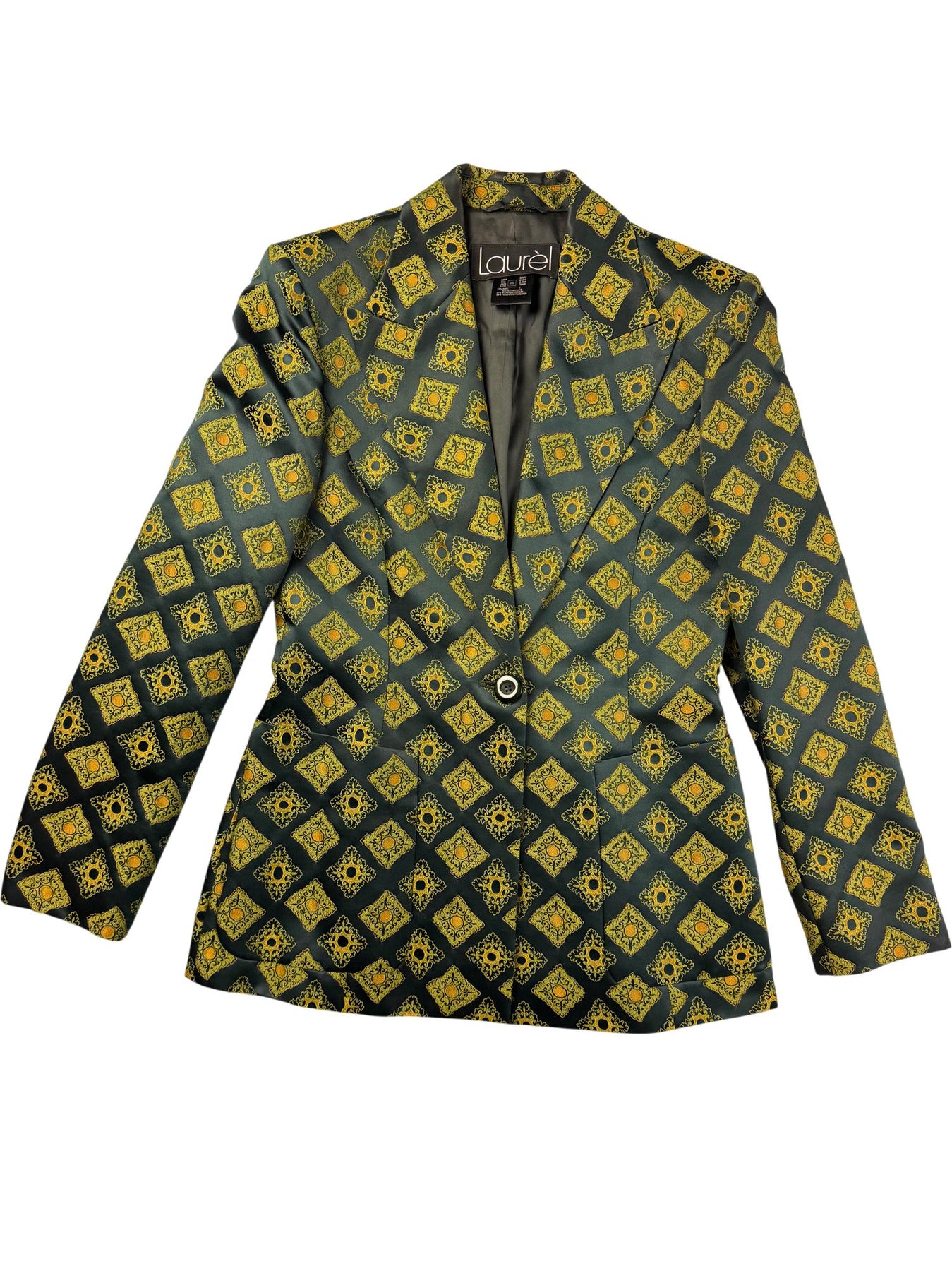 Geometric patterned blazer with yellow and green design. Made of 53% acetate, 27% rayon, and 20% polyester. Features a single-button closure.