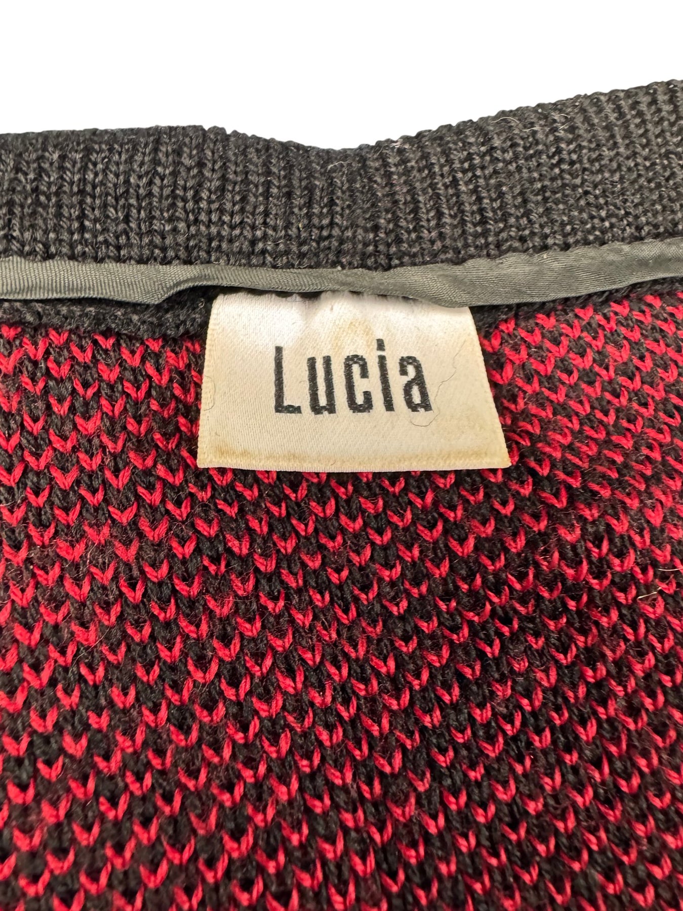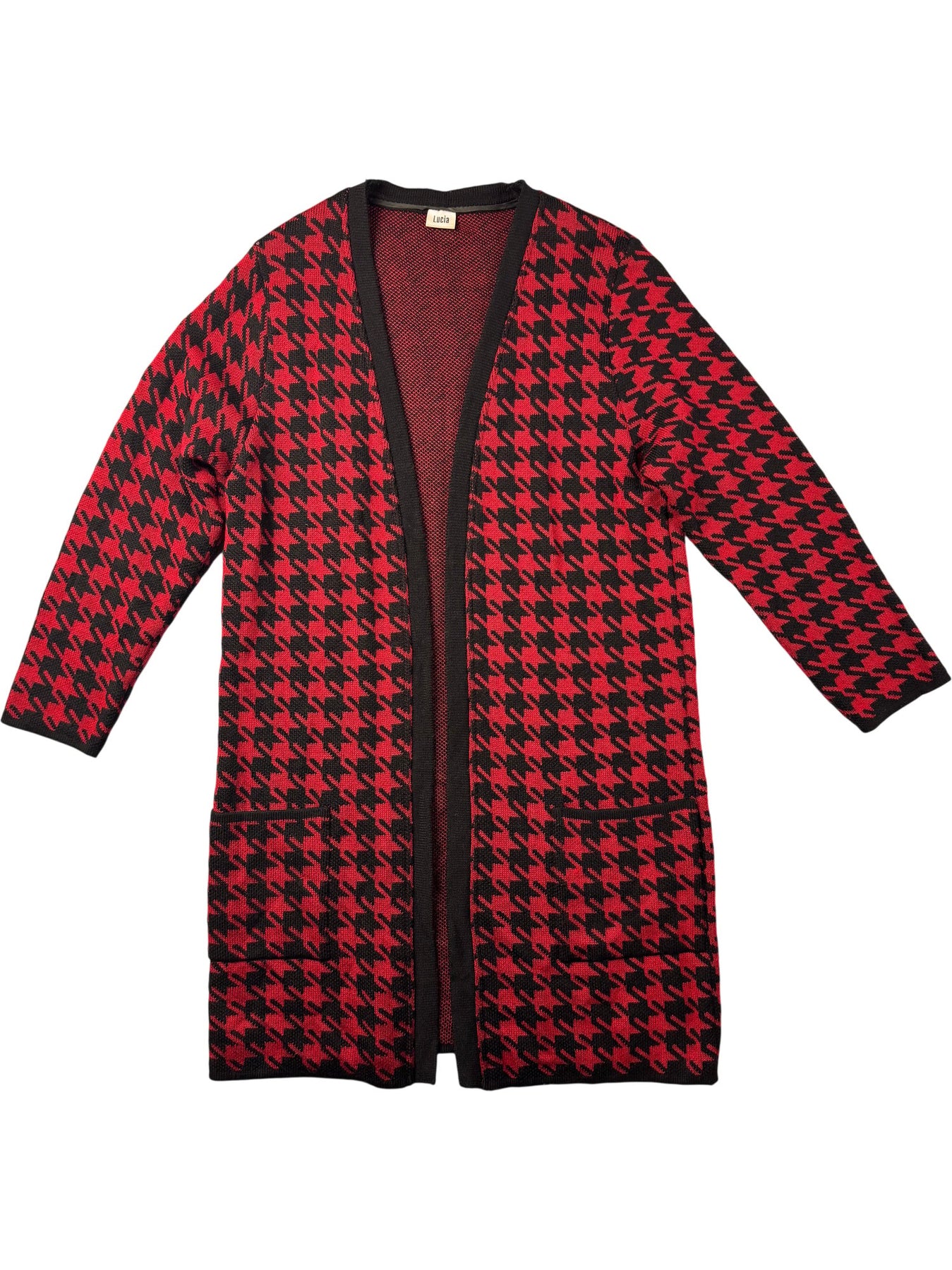 Red and black houndstooth pattern cardigan with two front pockets. Made in Germany from a knit fabric. Open front design.