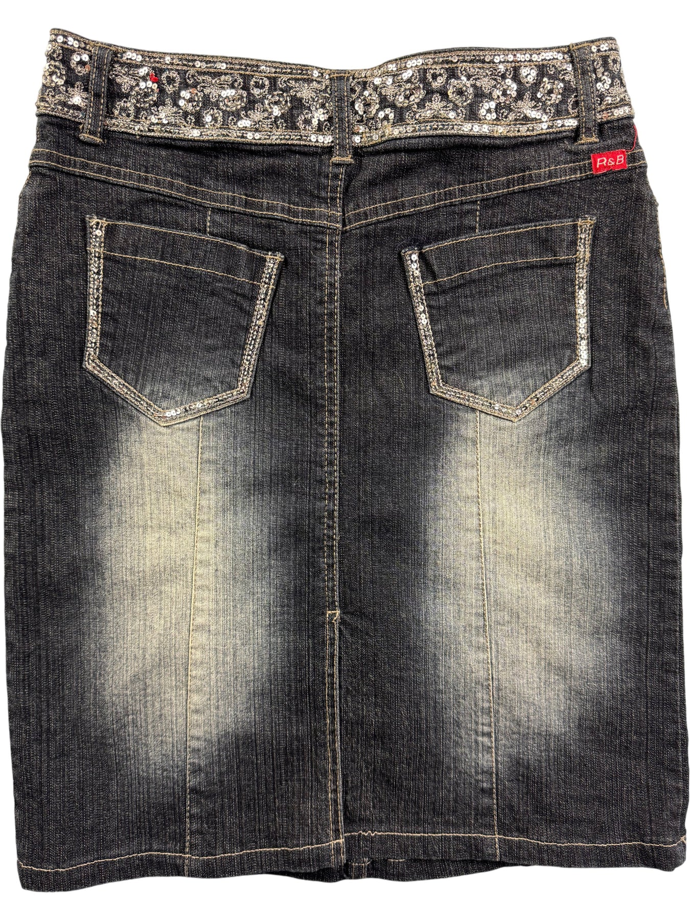Denim skirt featuring a sequined waistband with detailed stitching. Made of 97% cotton and 3% elastane for flexibility and comfort. Includes front and back pockets with decorative sequined trim.