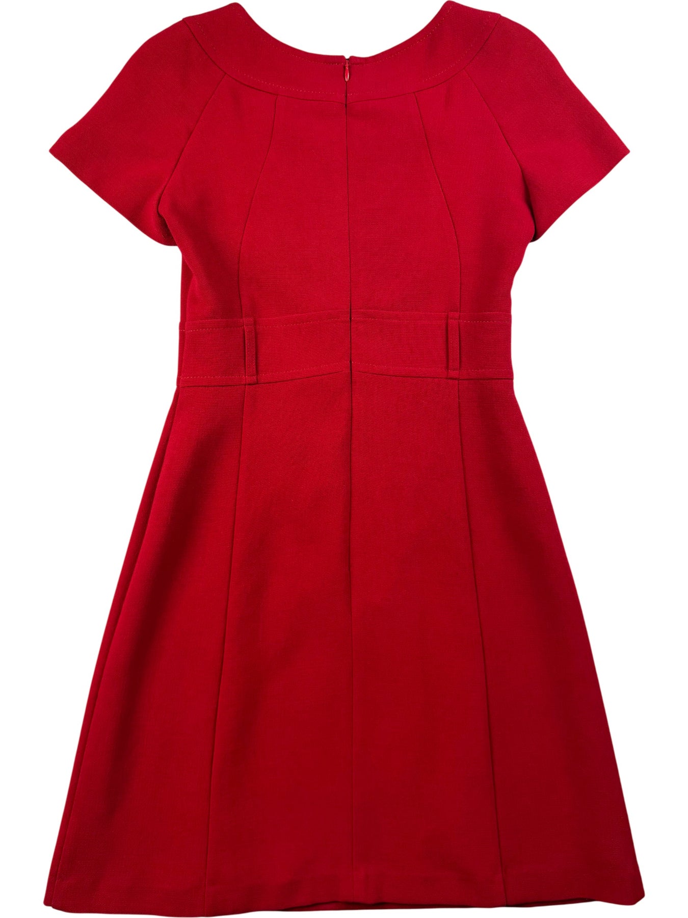 Red dress by Marks & Spencer with a classic round neckline and short sleeves. Features integrated waist detailing and a rear zip closure.
