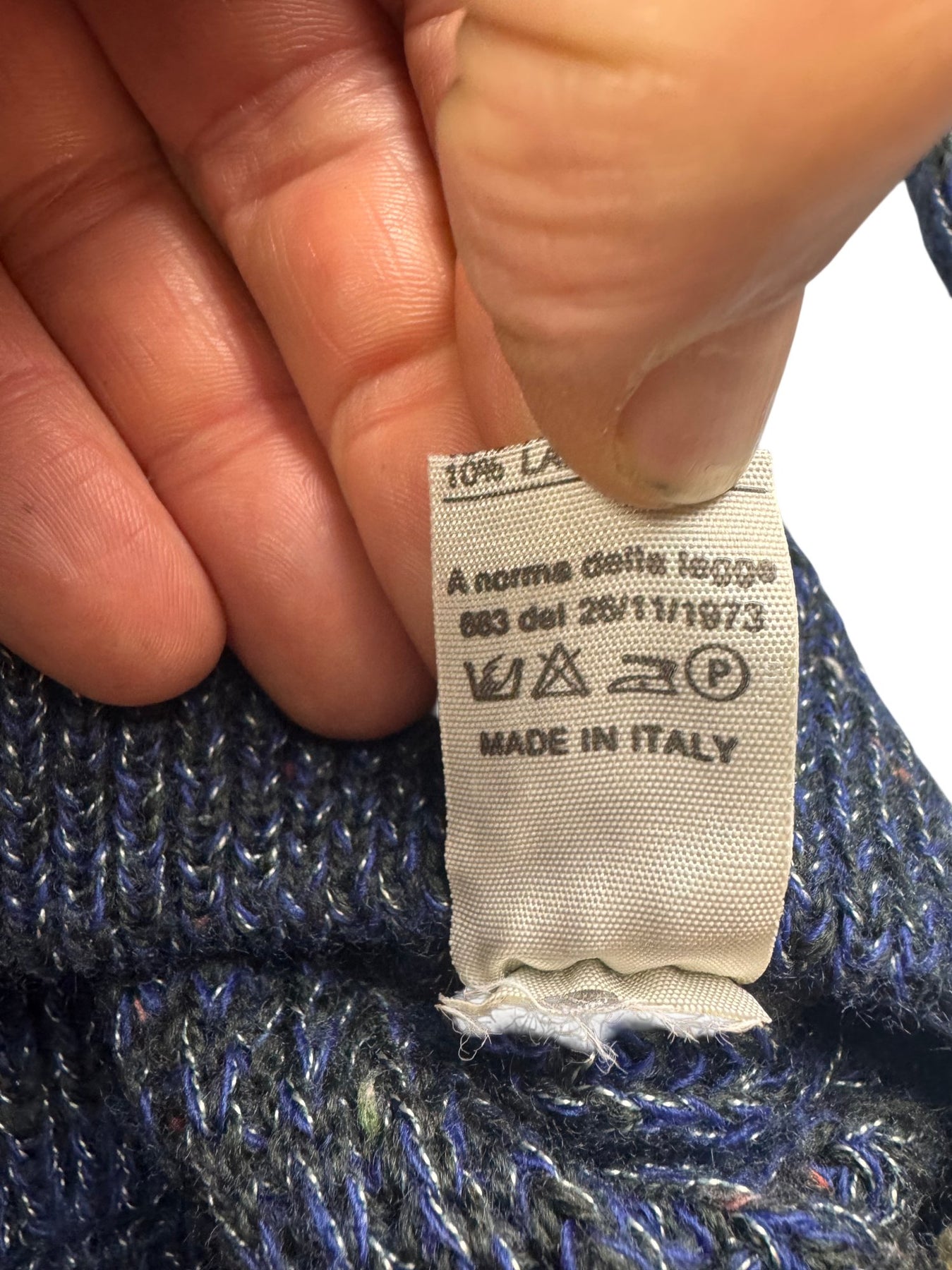 Ribbed knit San Valentino sweater featuring a V-neck design. Multicolor speckled pattern on a blue base. Made in Italy.