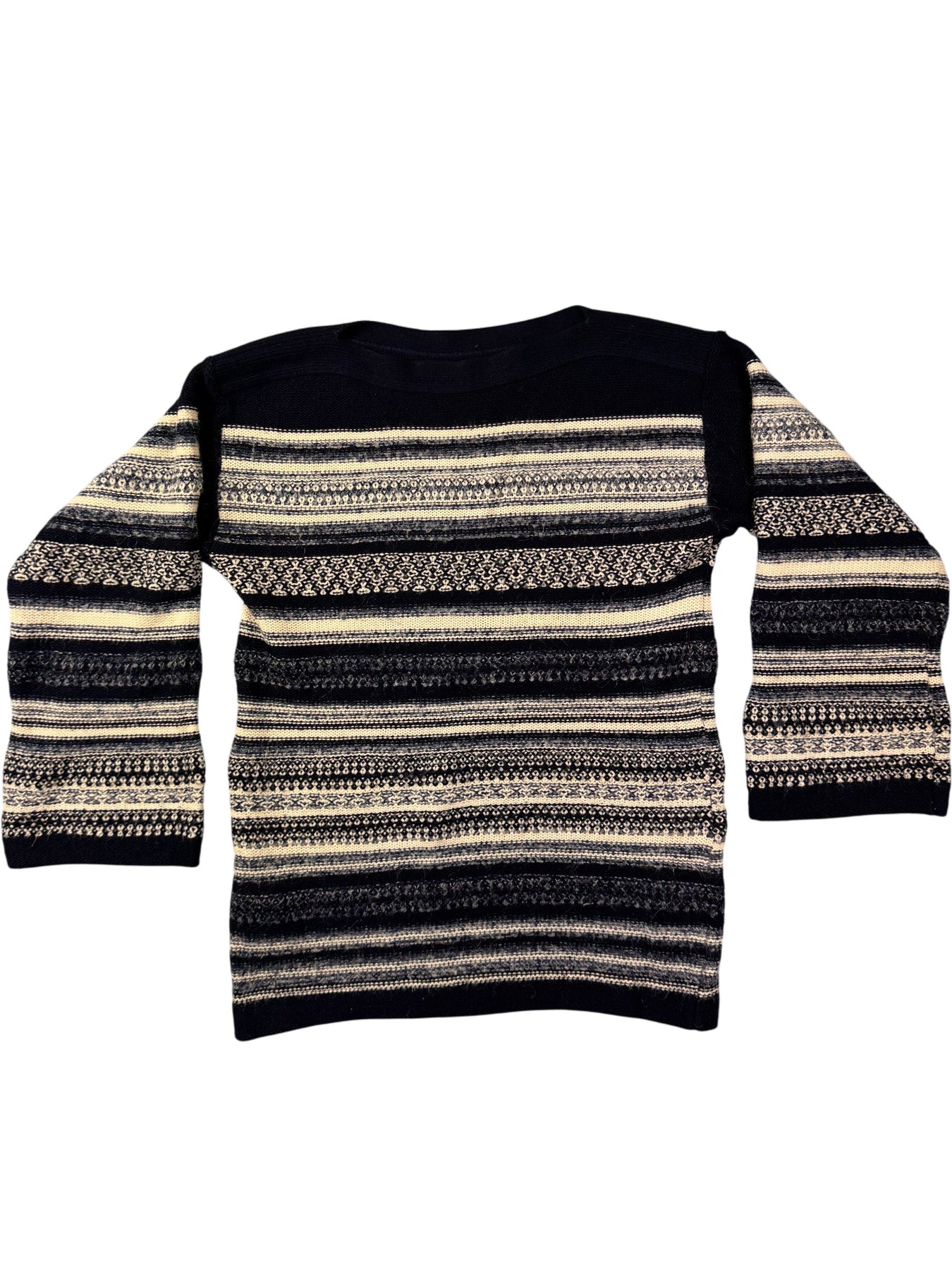 This long sleeve sweater features a striped pattern in a mix of dark and light shades. Made from 95% acrylic, 3% polyester, and 2% mohair, it offers comfort and durability. Manufactured in the UK.