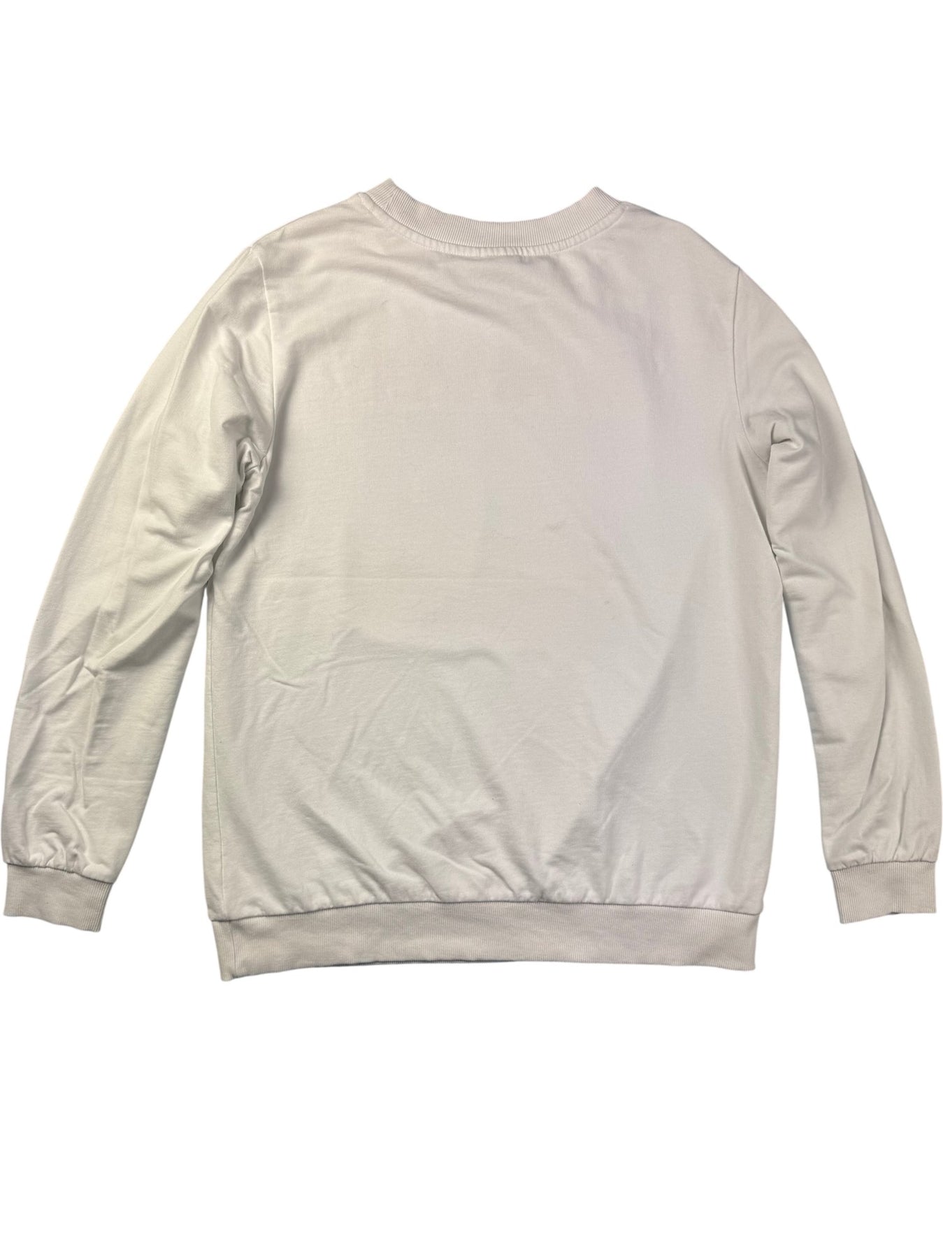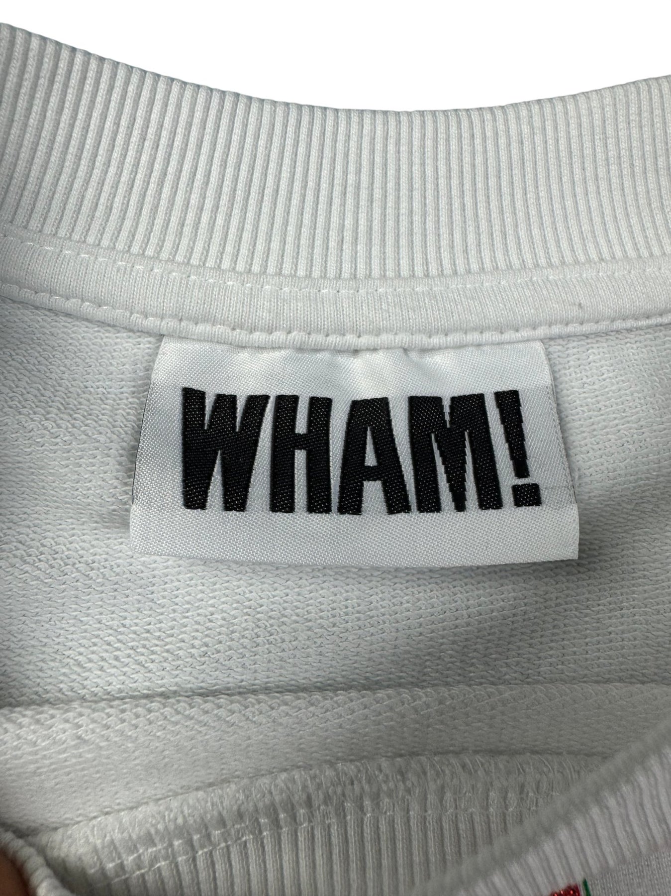 White sweatshirt featuring a graphic print of a Wham Christmas design. Made from 100% cotton for comfort. Crew neckline and long sleeves.