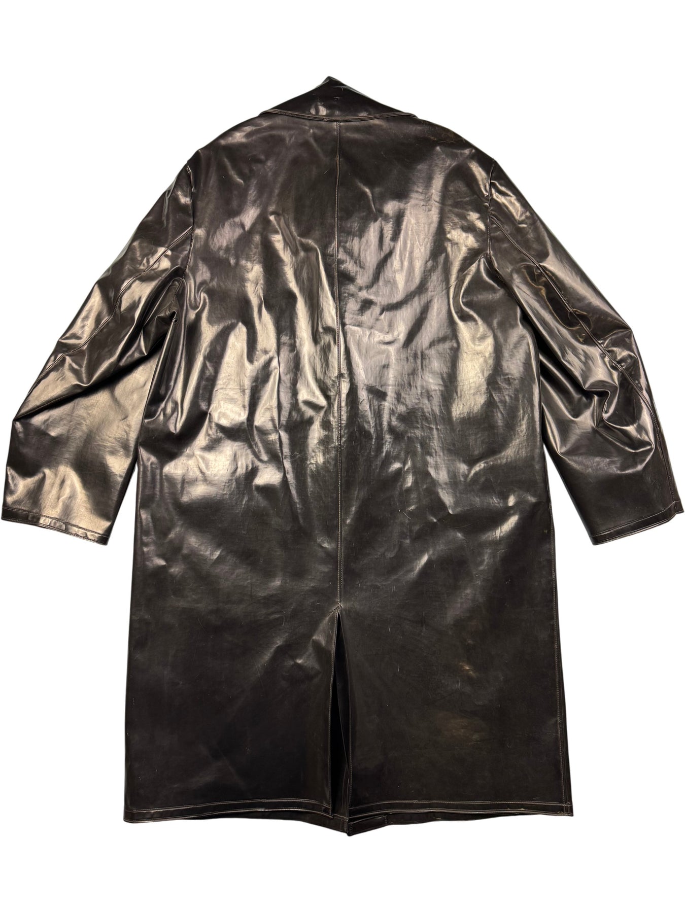 Glossy black rain coat with a long length and button closure. Features two large front pockets for practicality and a collared neckline. Made from a waterproof material suitable for wet weather.