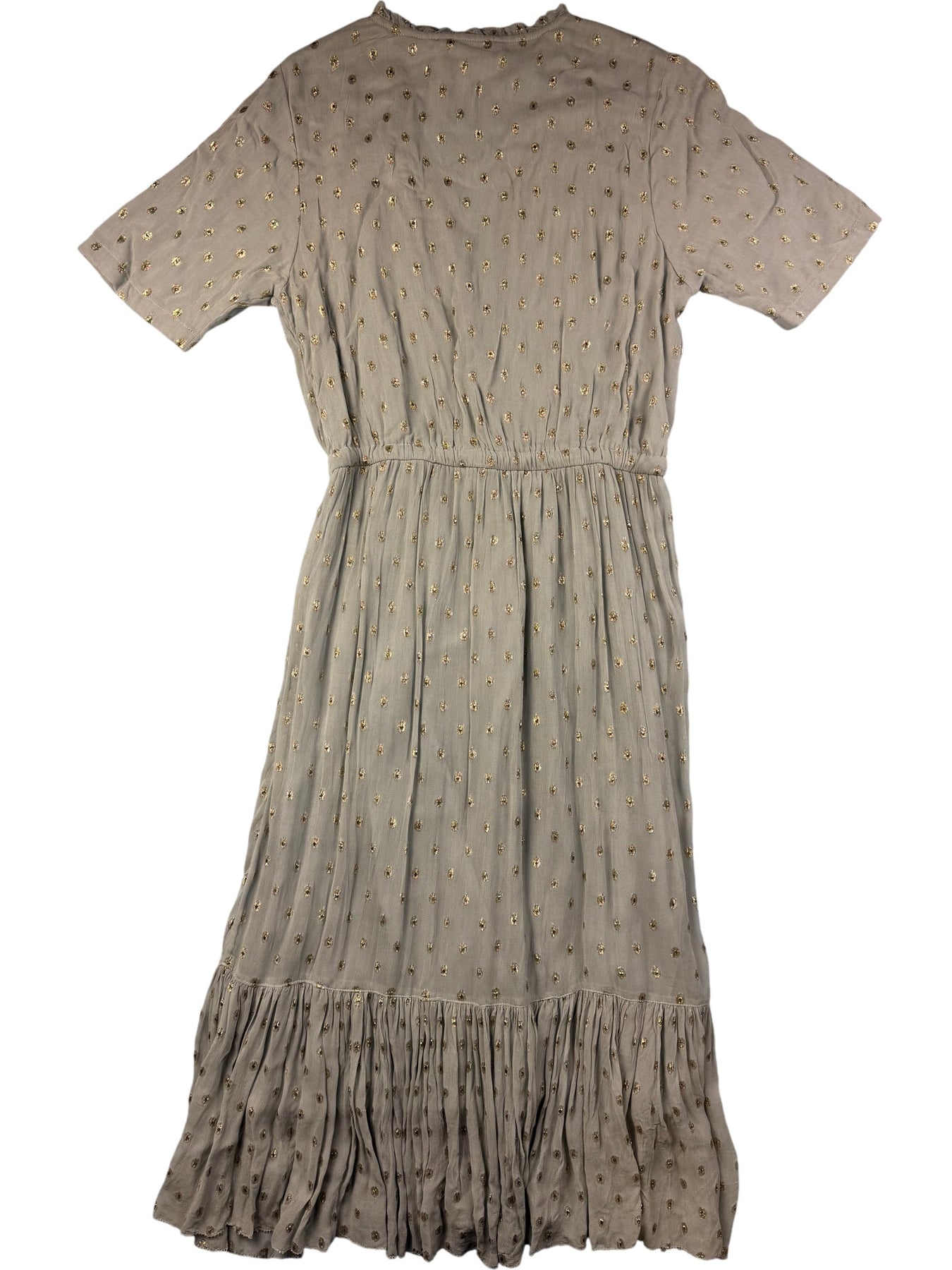 Leon & Harper grey dress featuring a wrap style with short sleeves. Embellished with subtle gold polka dots. Made of lightweight fabric for comfort.
