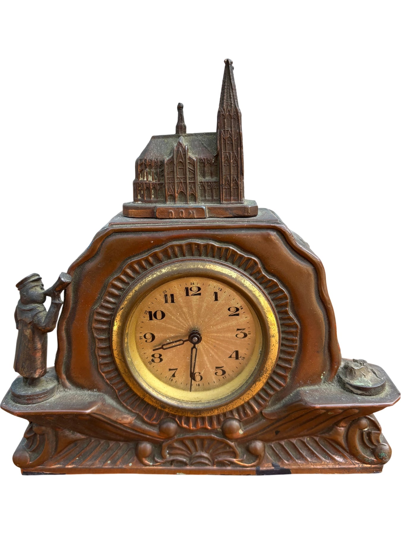 Features a detailed Gothic cathedral sculpture on top. Includes a vintage clock face with classic numerals. Crafted from metal with an intricate design.