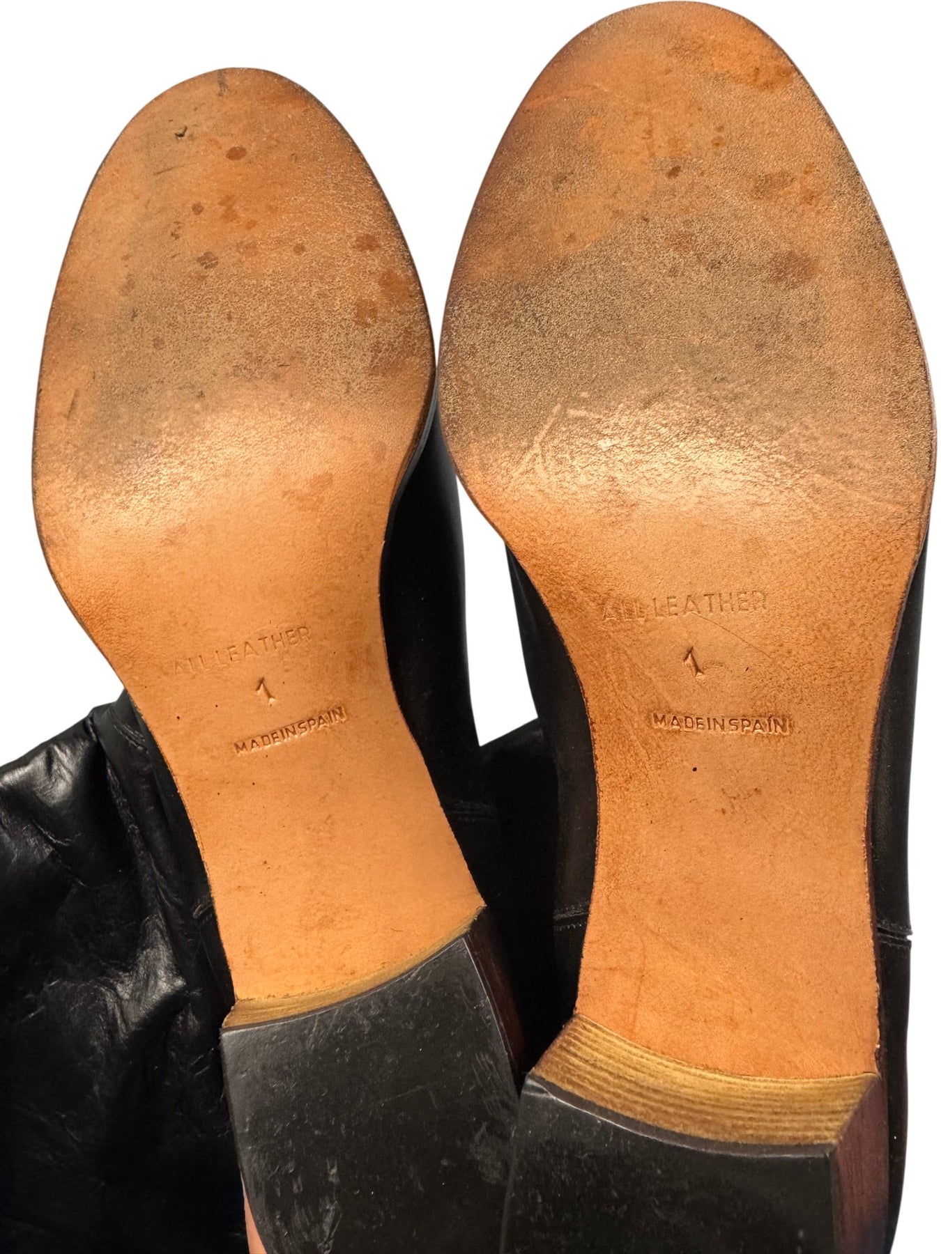 These are knee-high boots made from black leather, featuring a round toe design. The boots have a stacked heel and are made in Spain, with a leather sole for durability.
