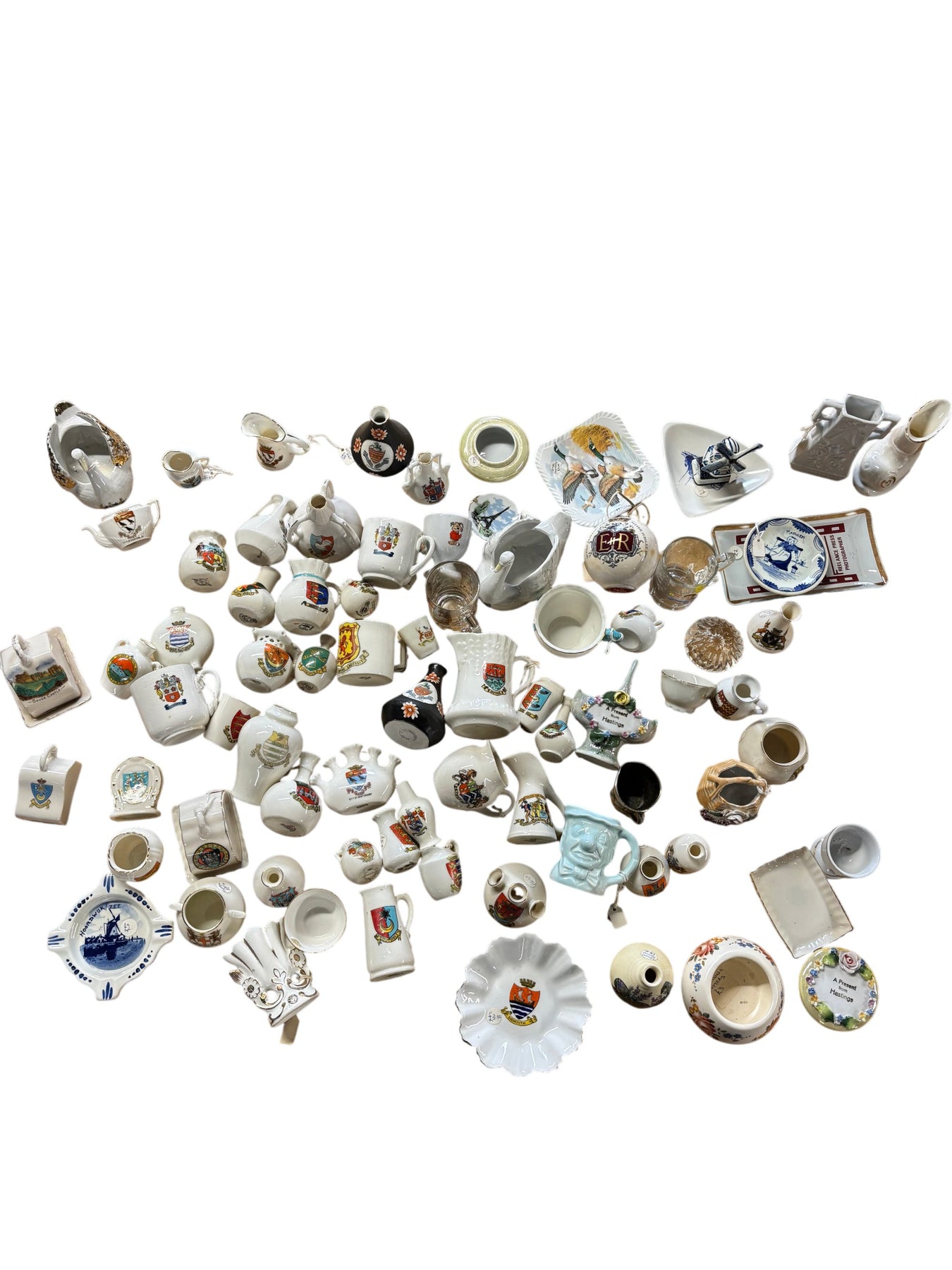 A diverse assortment of ceramics featuring various heraldic symbols and crests. Includes pitchers, plates, and decorative items, each with unique designs and colors. Made from porcelain with some items featuring intricate hand-painted details.
