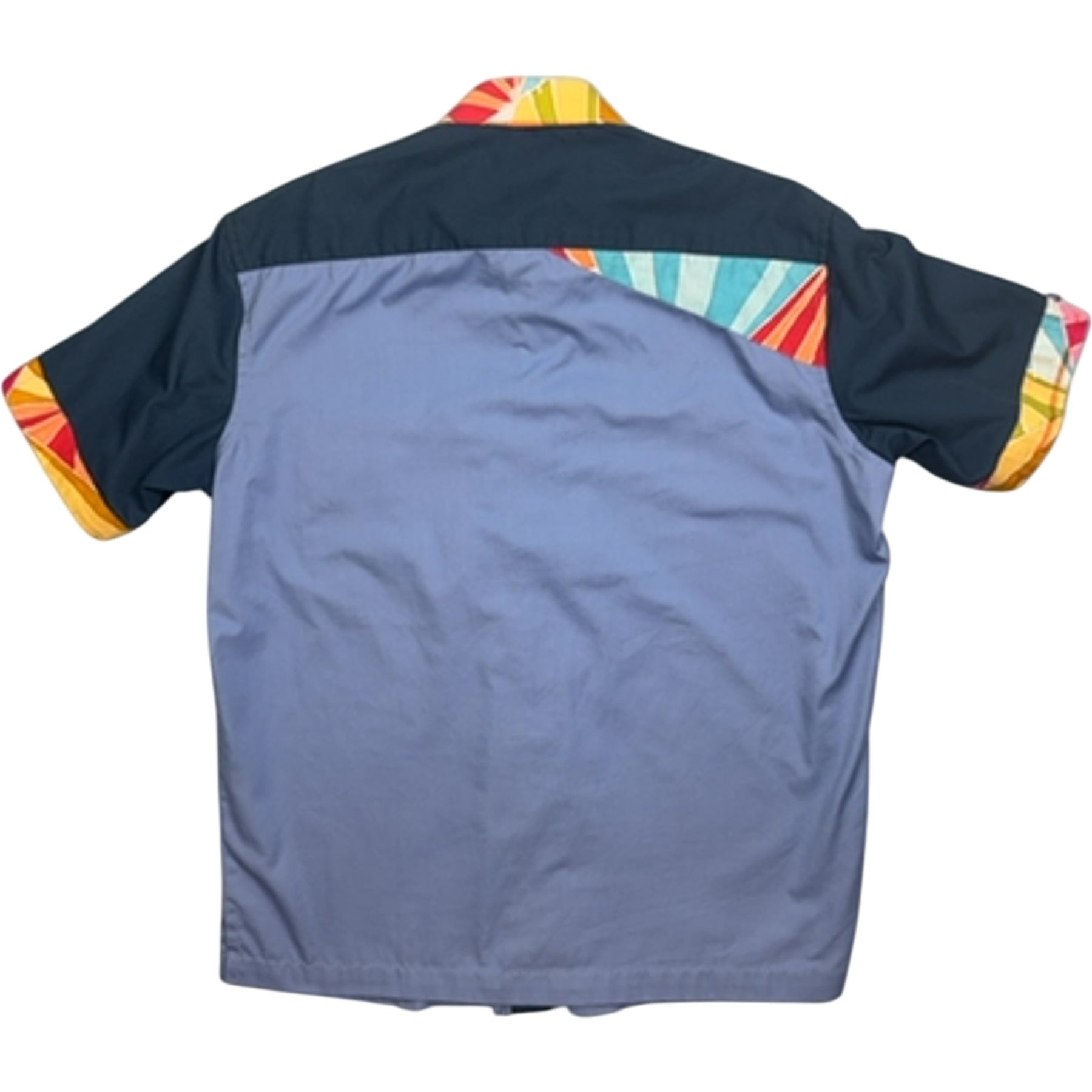 Colourful short-sleeved shirt with contrasting panels and a vibrant multi-coloured print on the collar and sleeves. Features a chest pocket with a matching trim detail.