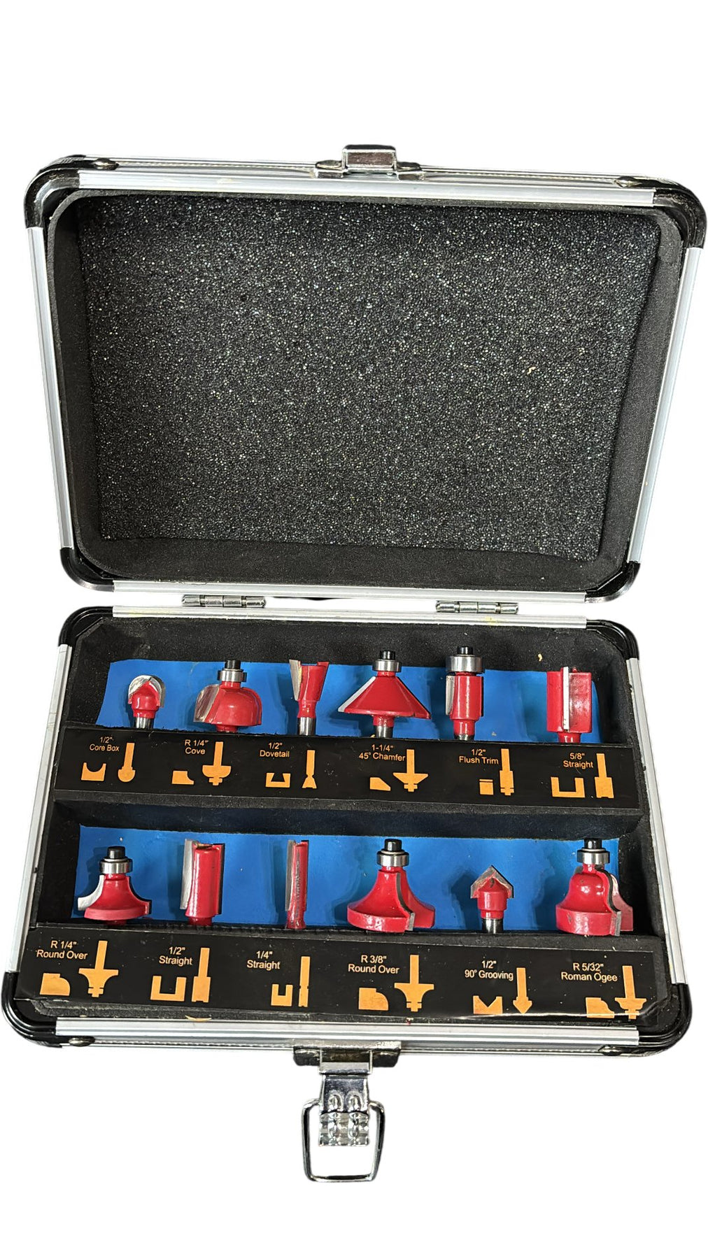12 piece set of tungsten carbide tipped router bits suitable for 1/4 inch shank routers; includes core box, cove, dovetail, chamfer, and flush trim bits. Comes in a rugged aluminum carry case.