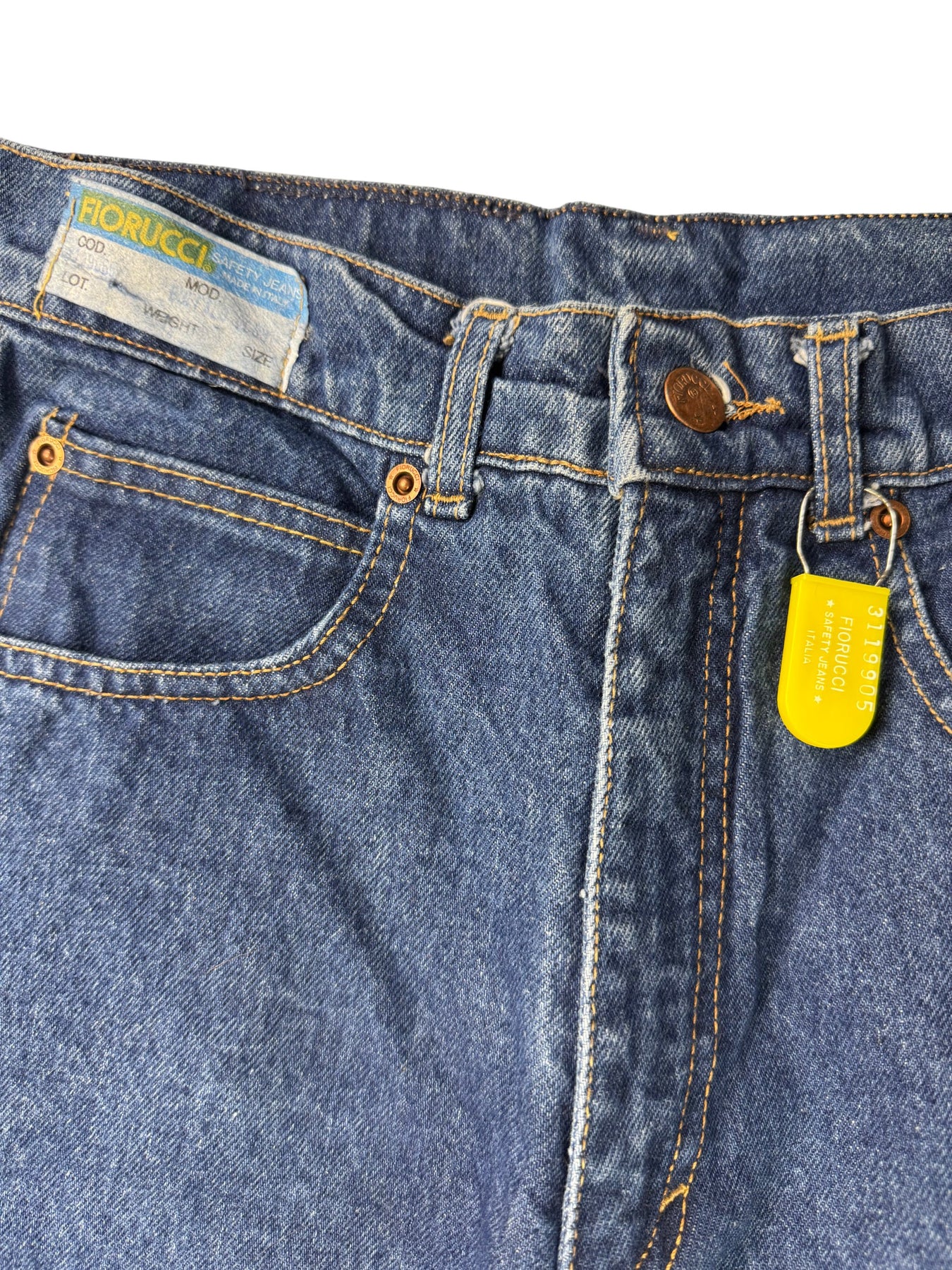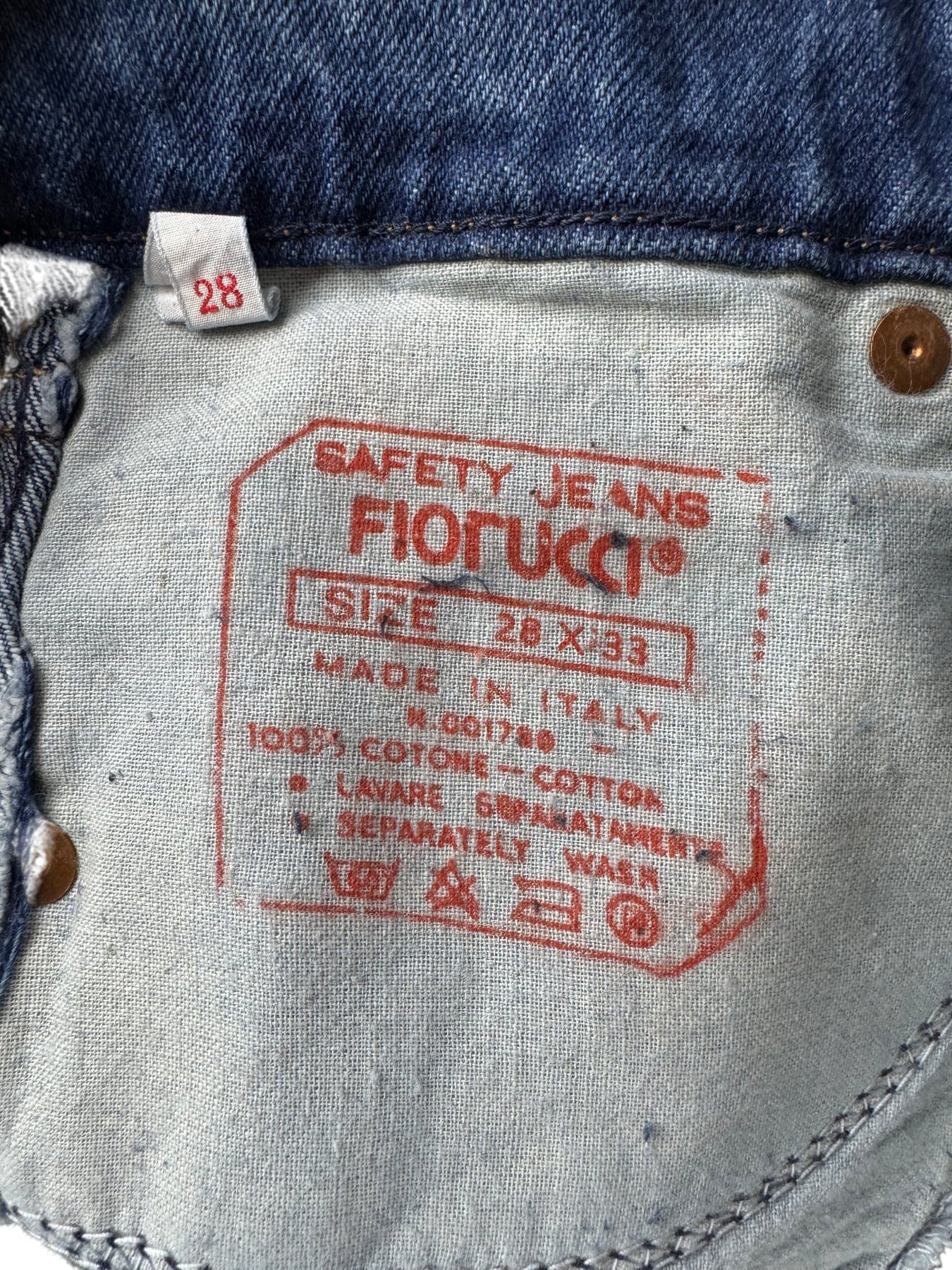 Fiorucci Safety Jeans made in Italy with 100% cotton. Classic blue denim with unique back pocket stitching and a branded leather patch. Features a button fly and belt loops.