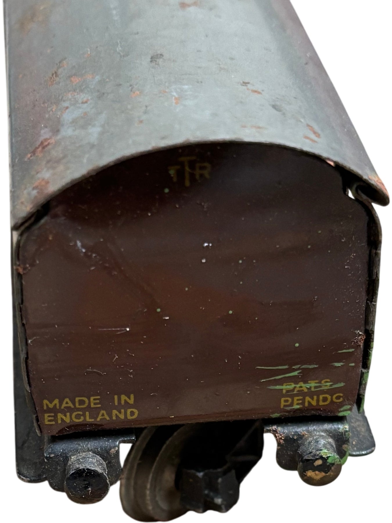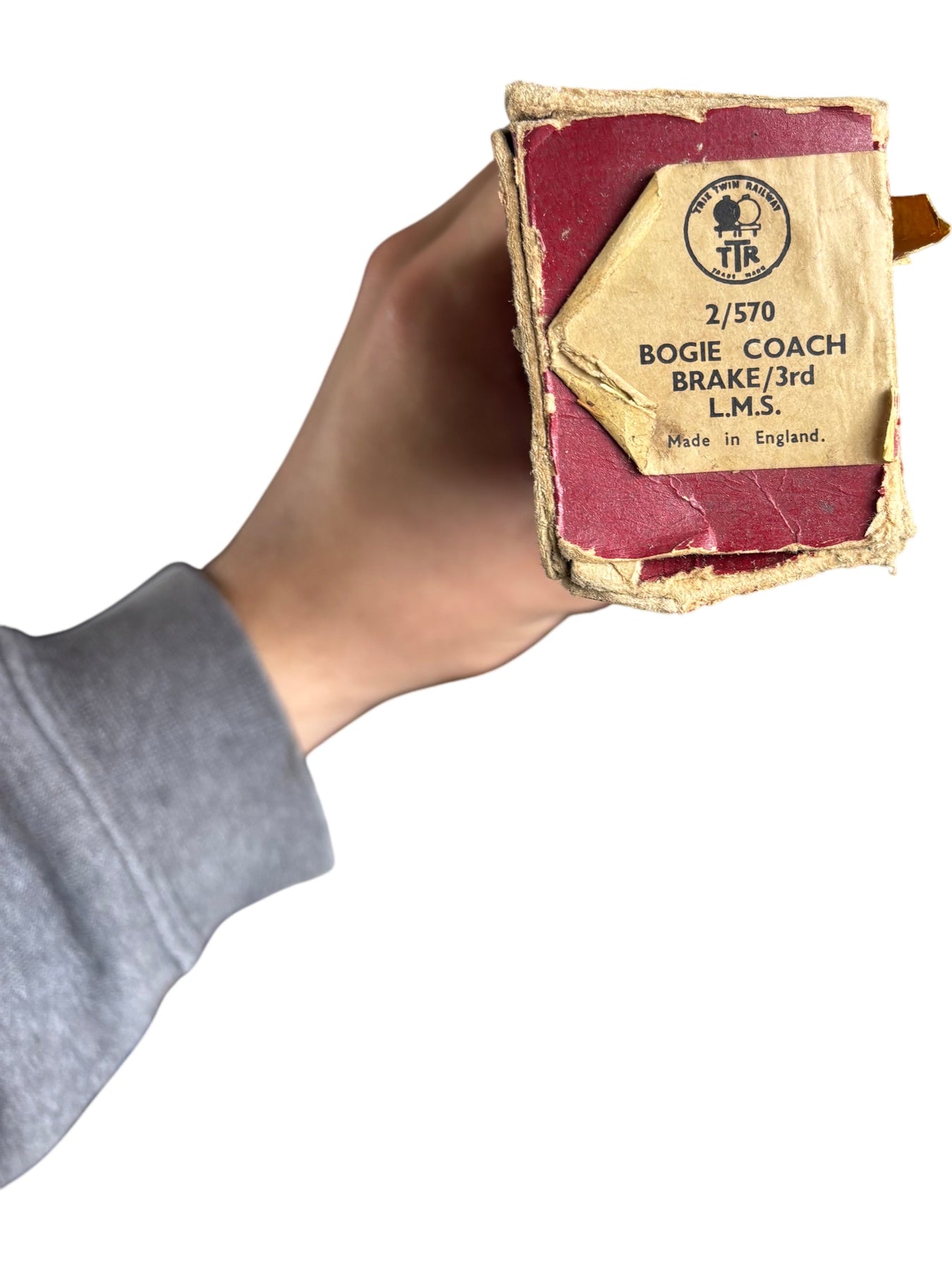 Vintage model train carriage featuring LMS logo, marked with 'Made in England'. Bogie coach brake design, model number 2/570. Original packaging included.