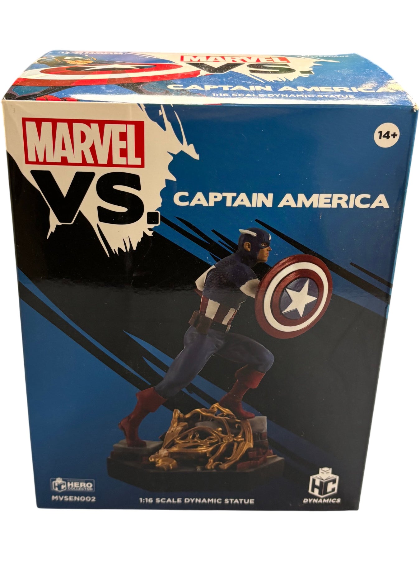 This 1:16 scale dynamic statue of Captain America is part of the Marvel VS collection. It features Captain America in a battle-ready pose with detailed sculpting and coloring. The statue comes with a decorative base depicting a battleground setting.