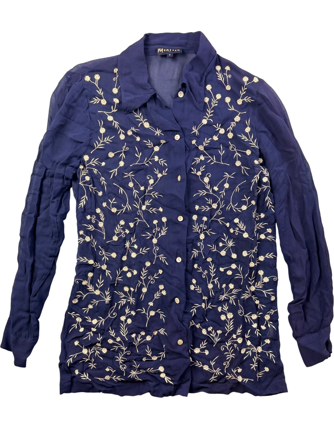 Navy blue blouse with floral embroidery. Made of 100% viscose. Features buttoned front and long sleeves.