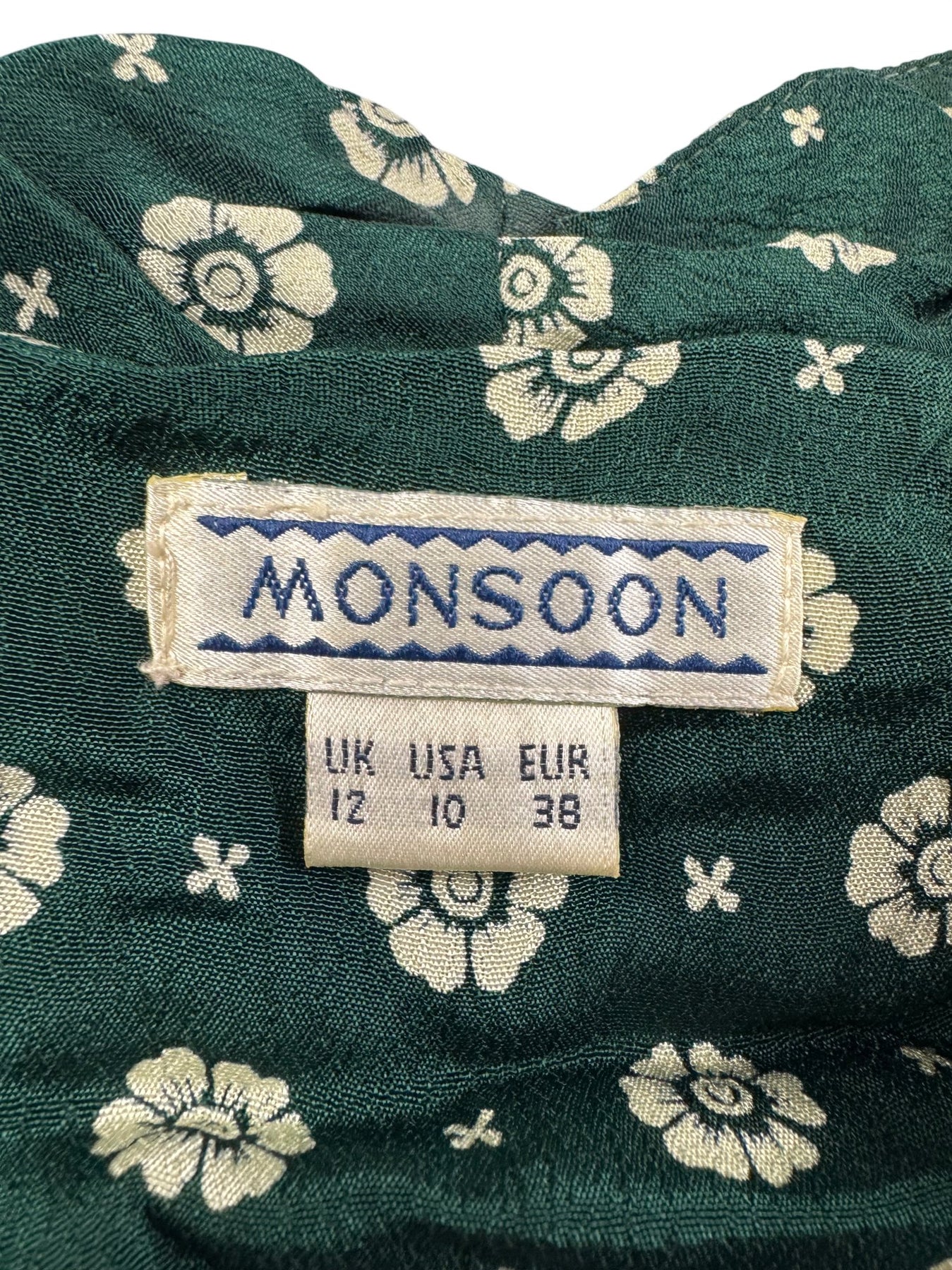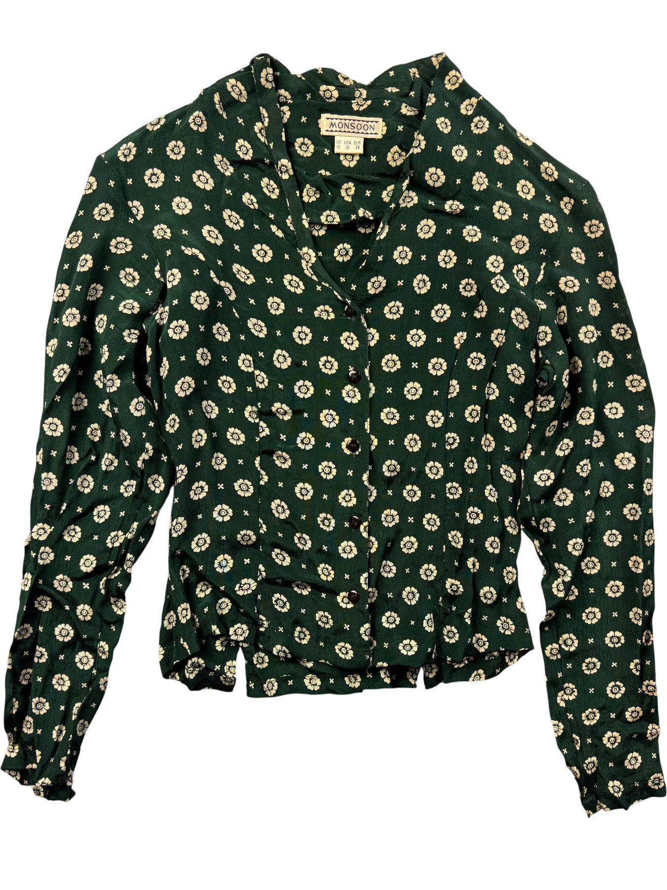 Green blouse with floral pattern made of 100% viscose. Features long sleeves and button-up front. Monsoon label inside.