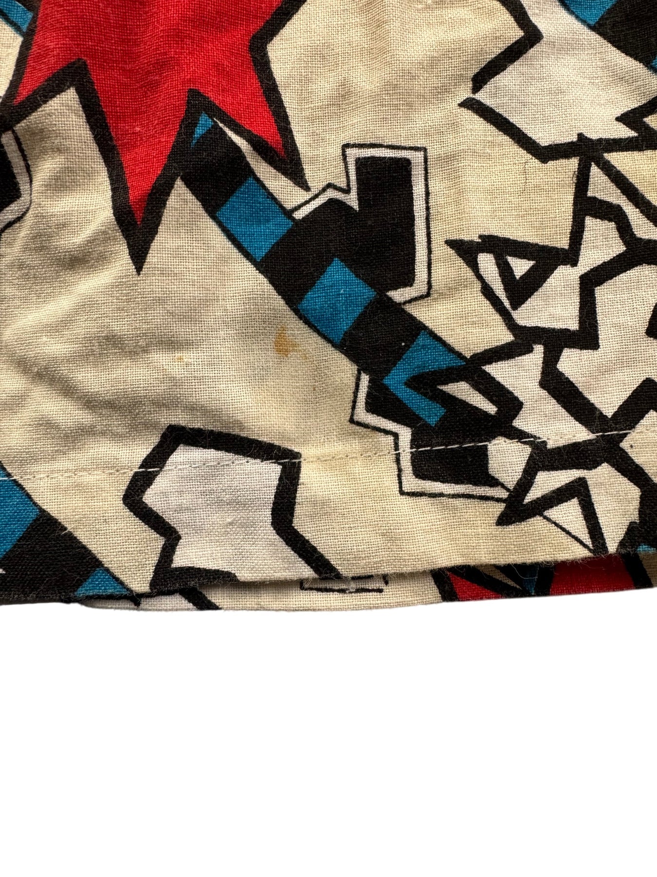 Ocean Pacific short-sleeved shirt featuring a colourful geometric star pattern. Made from cotton and styled in the USA, it includes a button-up front and a classic collar.