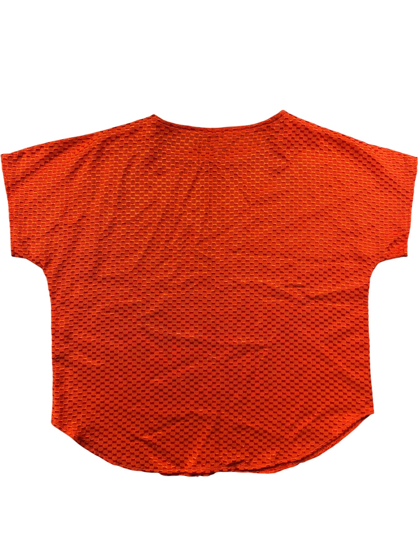 Bright orange top with a textured pattern, short sleeves, and button detail on the shoulder. Made from a lightweight fabric.