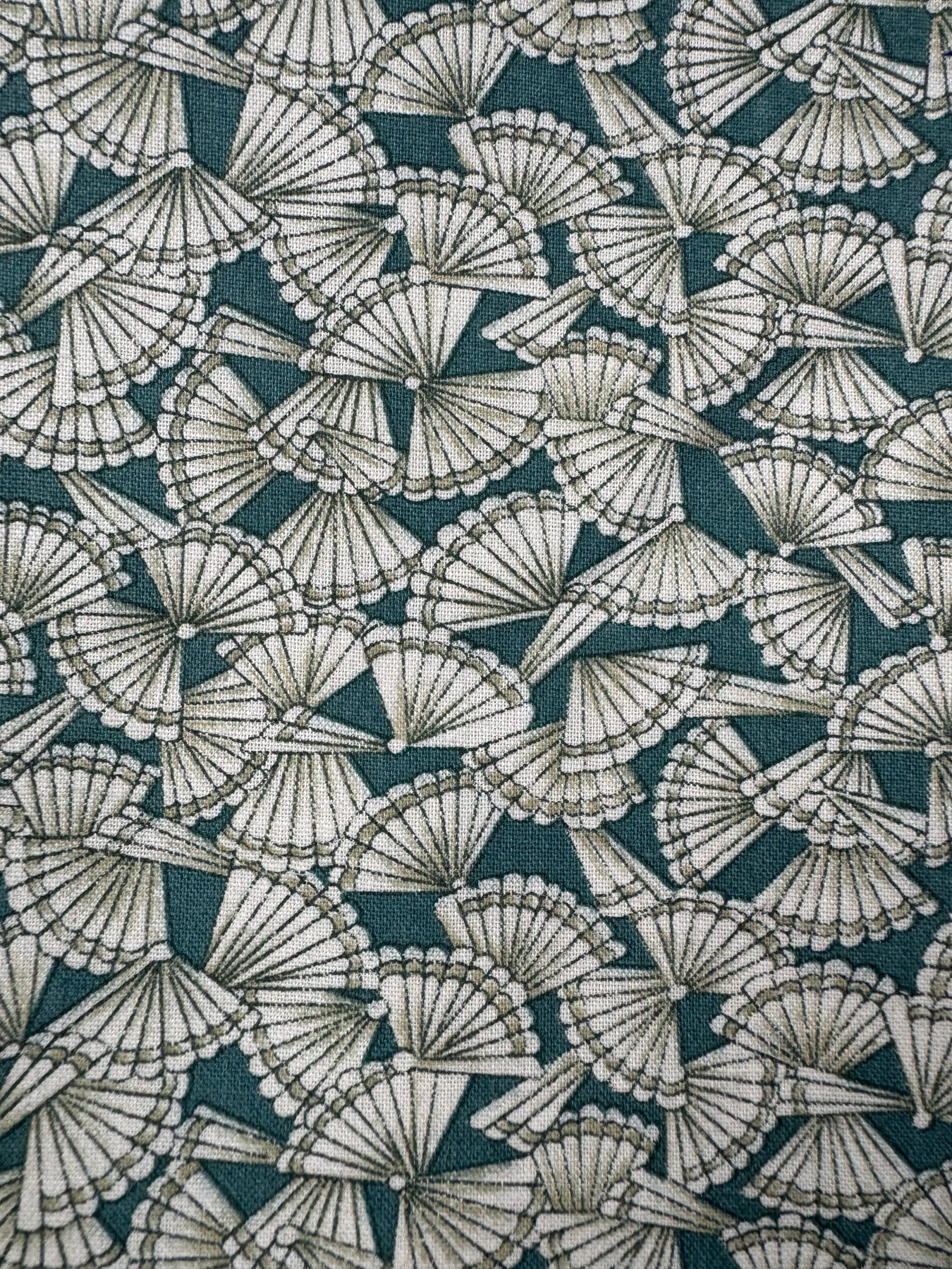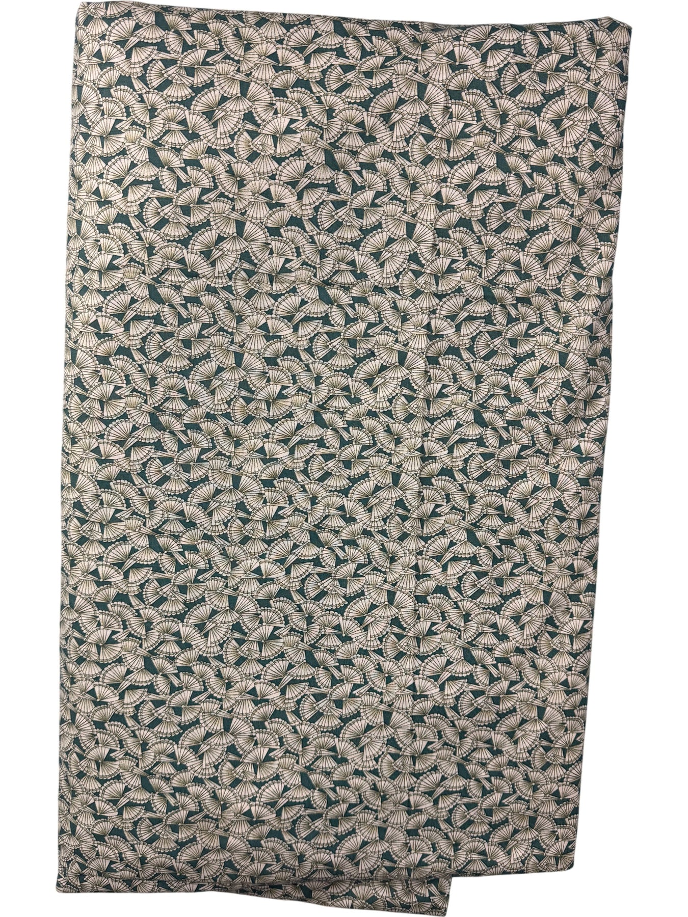 Green fabric material featuring an intricate fan-like pattern. Suitable for various arts and crafts projects.