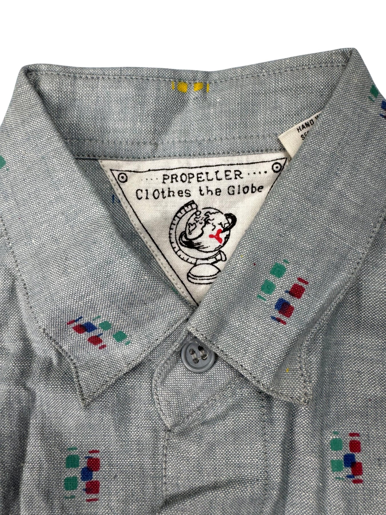 Grey short-sleeved shirt with colourful abstract patterns. Features a front pocket and button-down design. Made by Propeller, showcasing a classic collar style.