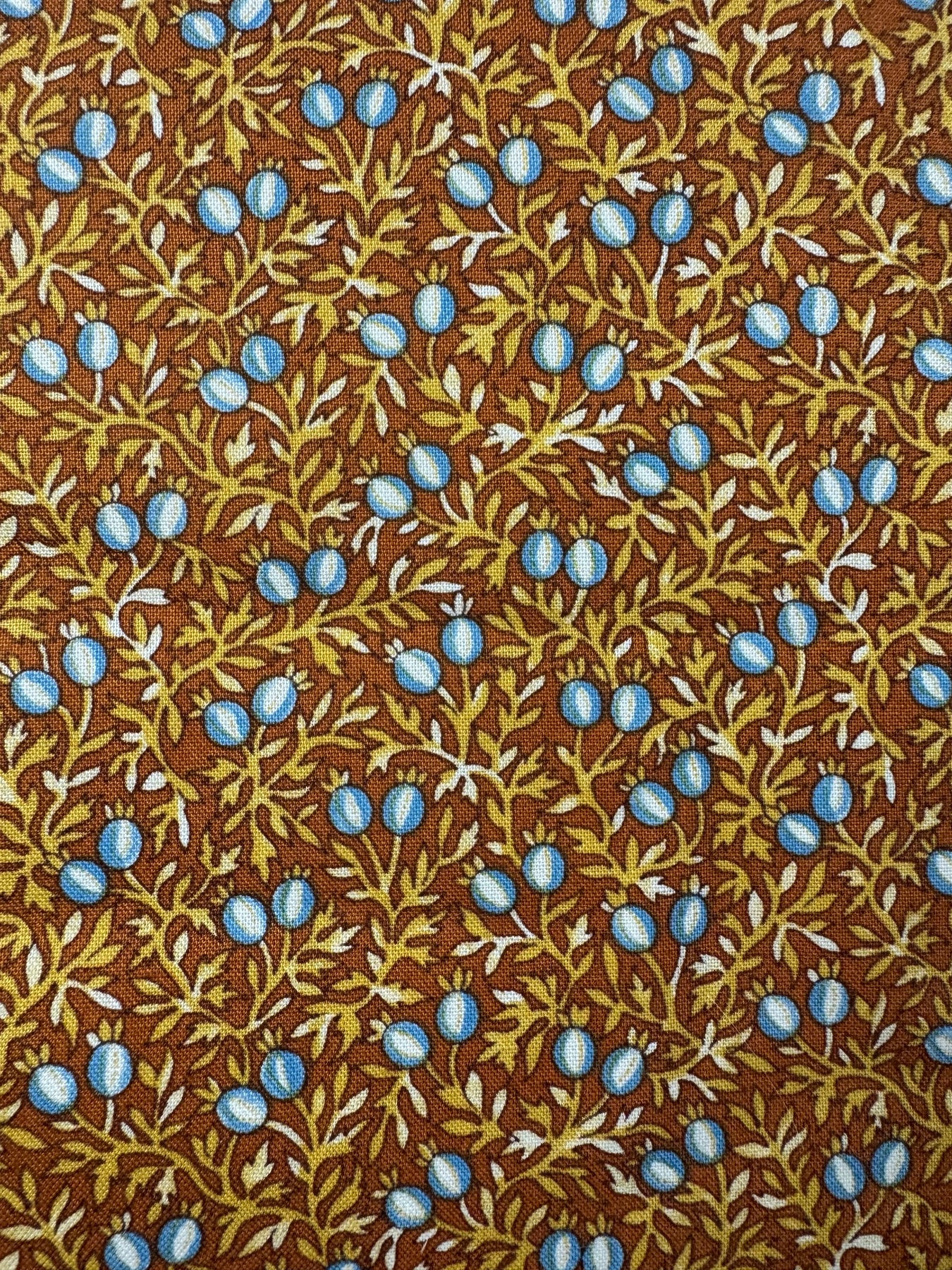Cotton fabric featuring a repeated floral pattern with blue and brown hues. Designed by Rudolf den Haan for TT Europe LTD. Ideal for crafting and sewing projects.