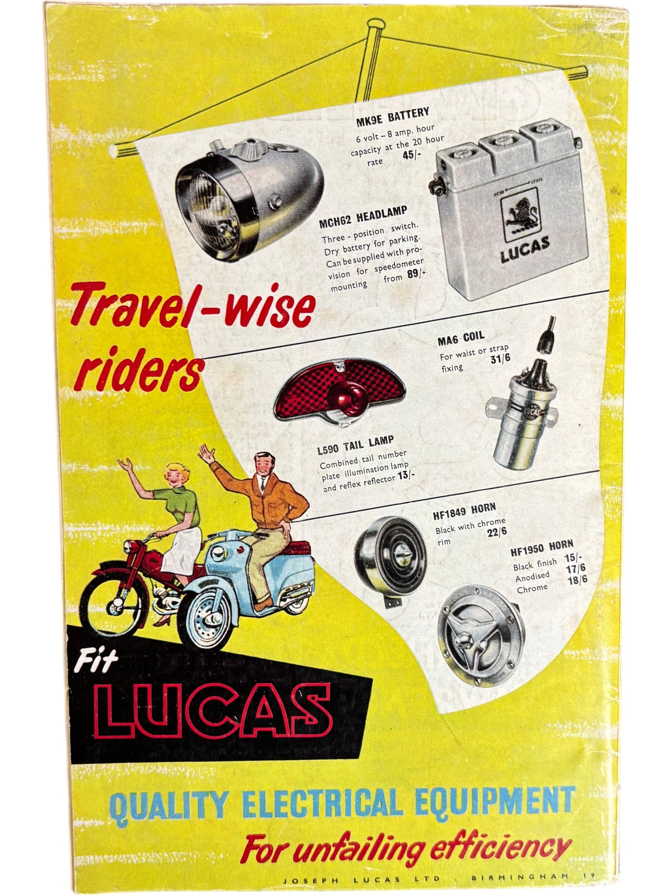 This magazine from April 1959 features Lambretta scooters and advertisements for Lucas electrical equipment. It includes imagery and content related to scooters and three-wheelers, catering to vintage scooter enthusiasts.