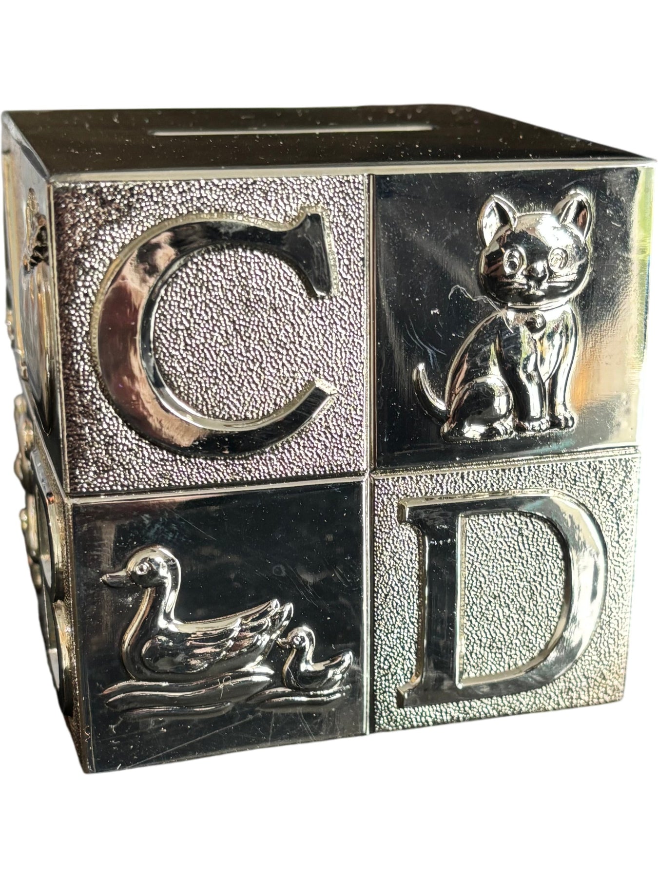 Alphabet block-shaped piggy bank with silver finish. Features embossed letters and animal designs. Includes a coin slot on top and removable bottom panel for easy access.