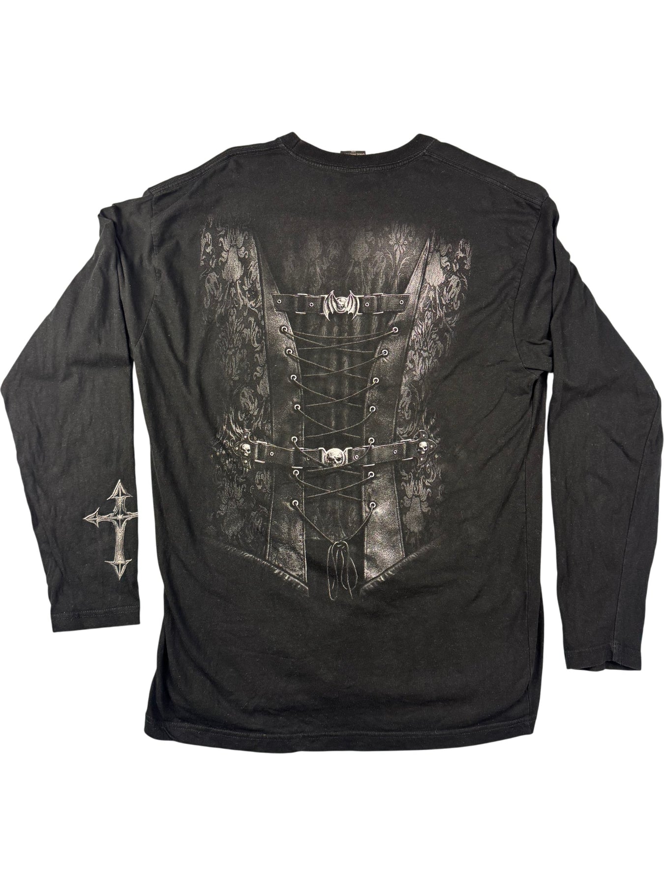 Black long sleeve t-shirt featuring a gothic design with a skull and chains motif on the front and back. Made from 100% cotton with detailed graphic prints. Crew neckline with a Spiral Direct label.
