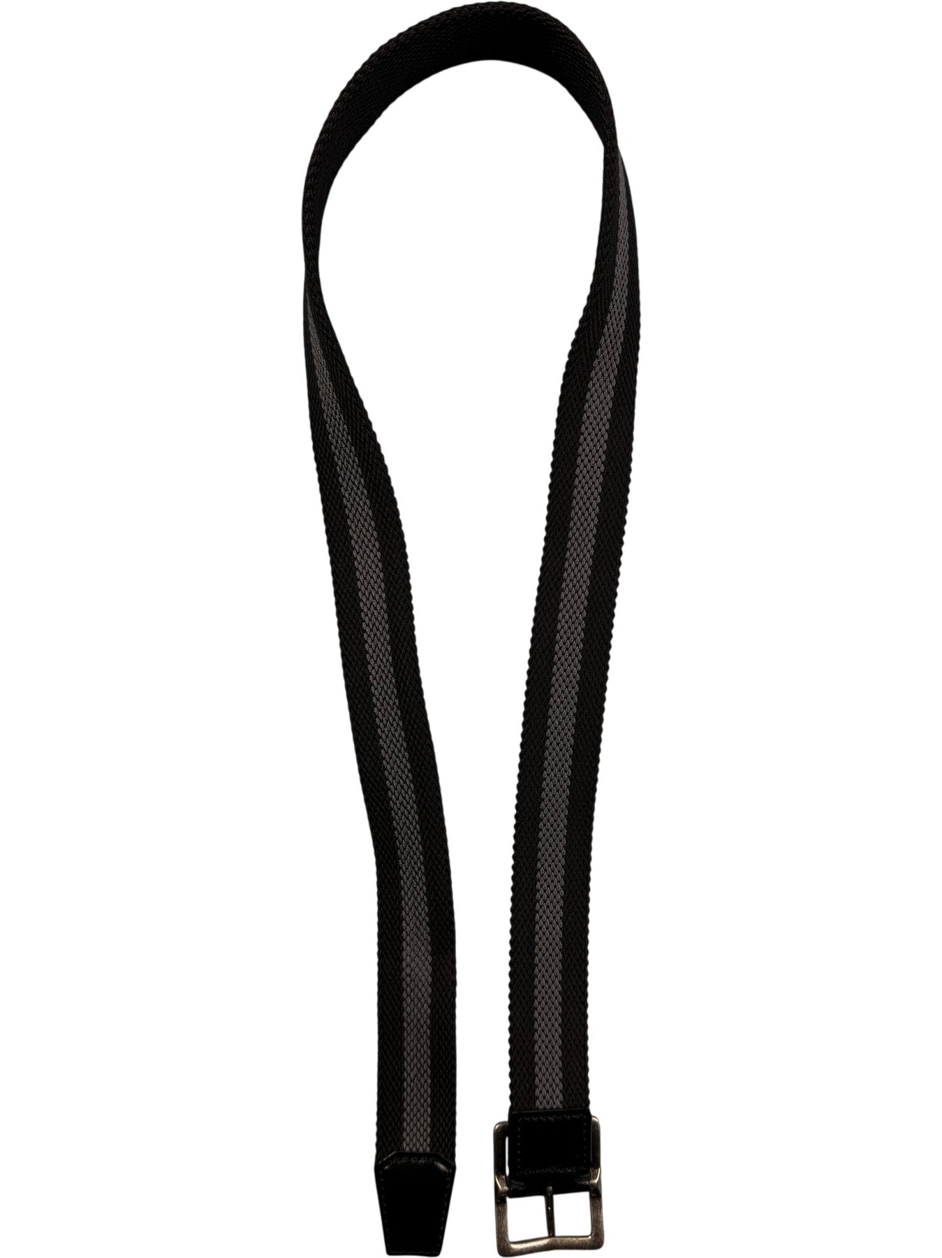 Striped fabric belt with a metal buckle. Features two-tone pattern and durable stitching. Designed for versatile wear with various outfits.