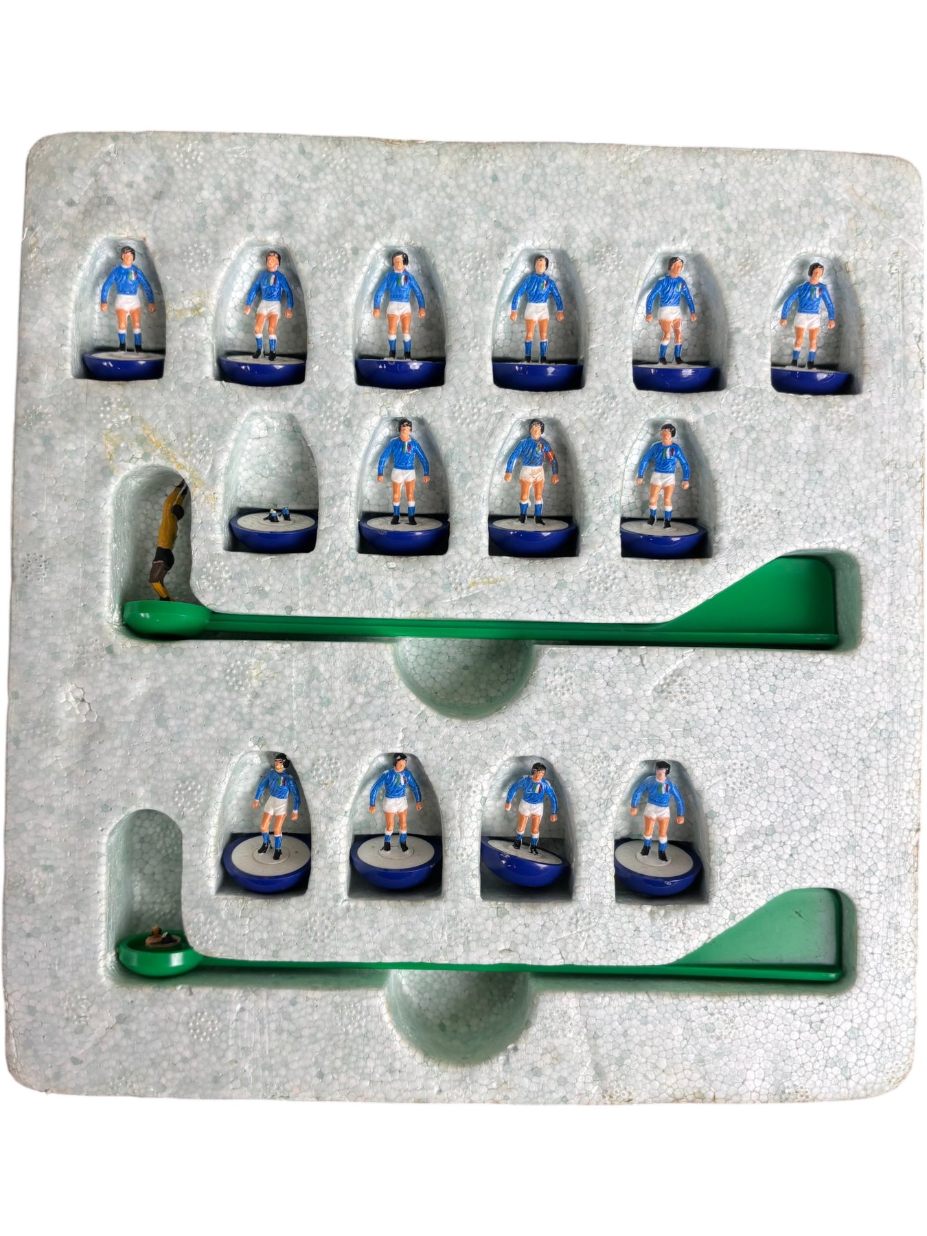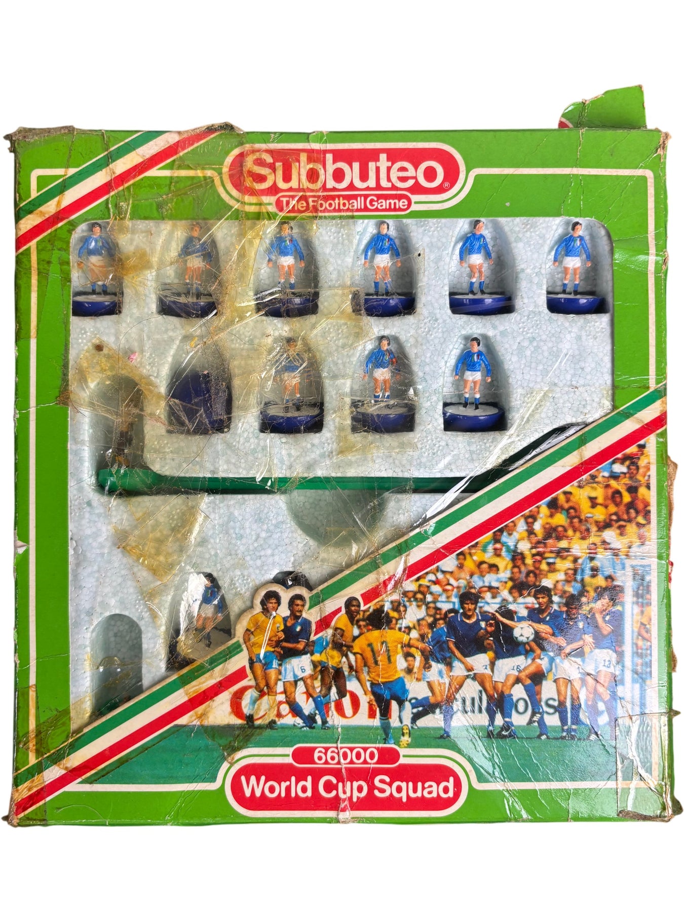 This Subbuteo set includes a World Cup squad of 11 football player figures and a goalkeeper. The figures are in classic blue and white kits, styled after the Italian national team. The set comes with original packaging that features the Subbuteo branding and a football match scene.