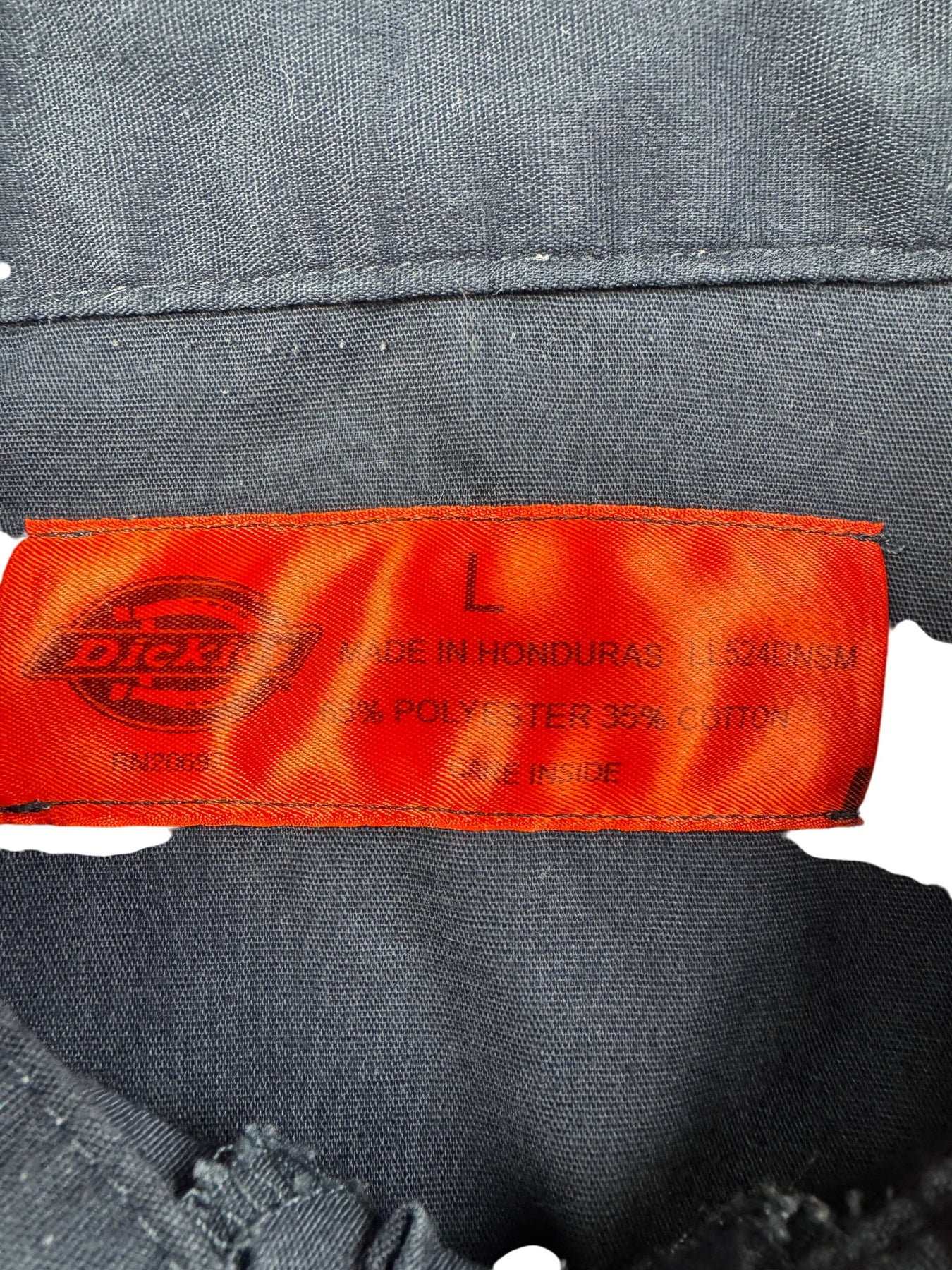 Two-tone design with beige and navy. Made of 65% polyester and 35% cotton. Features front button closure and two chest pockets.