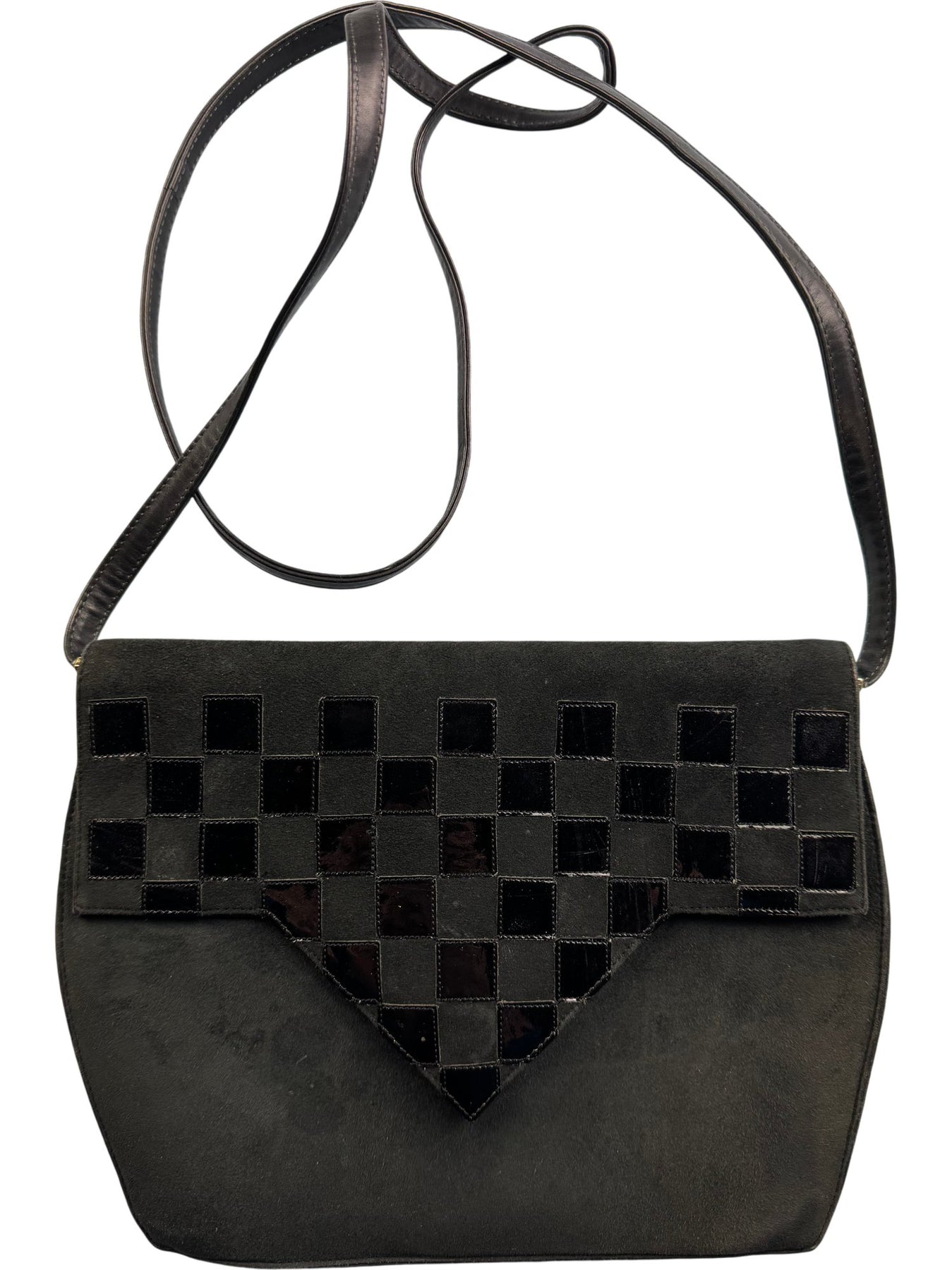 Italian-made Valbrenta shoulder bag with a black leather exterior and checkered pattern. Features an interior zippered pocket and a magnetic flap closure.