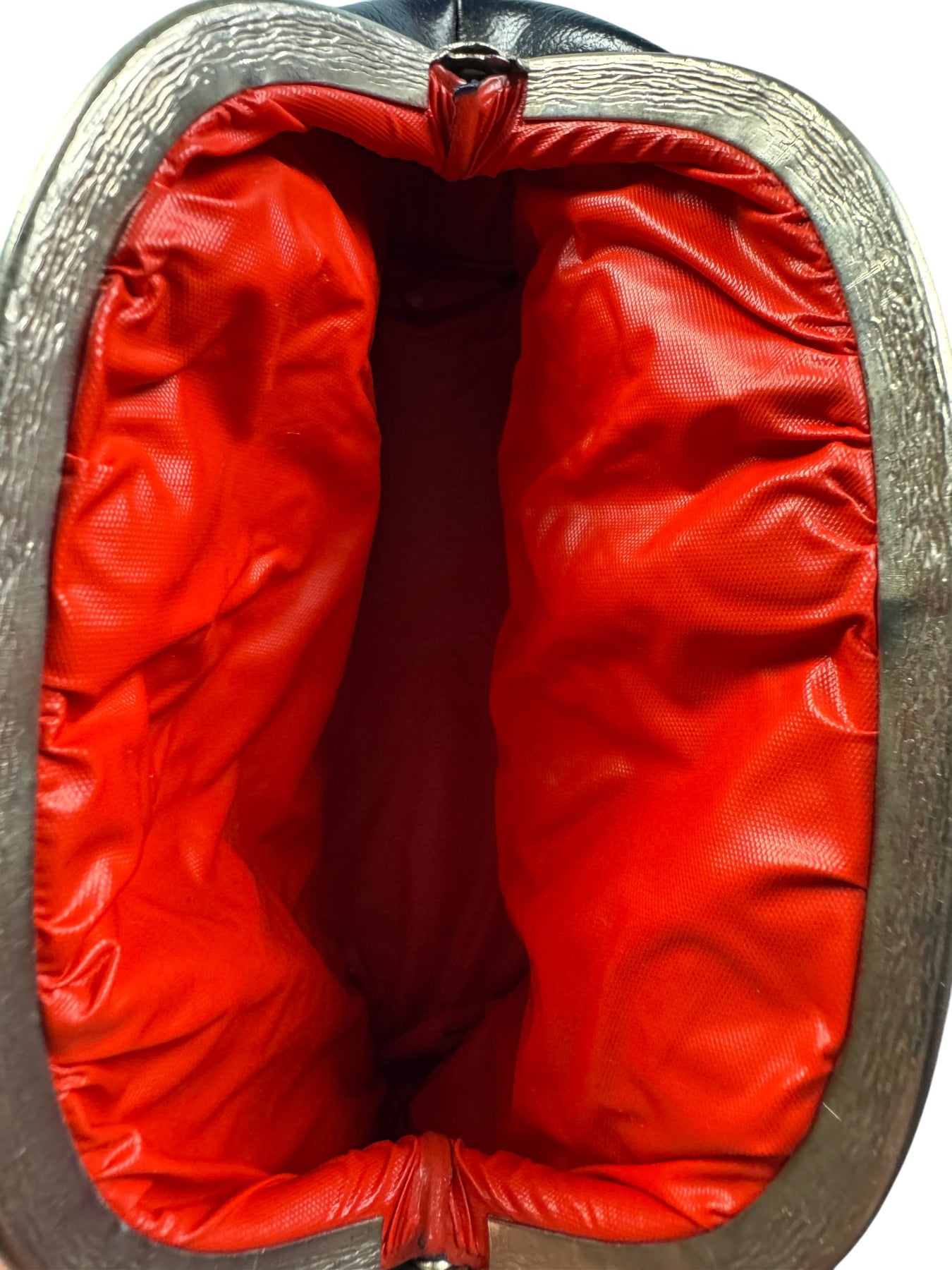 Classic coin purse with clasp closure and red interior lining. Crafted from black leather with a silver-tone frame. Compact and convenient for everyday use.