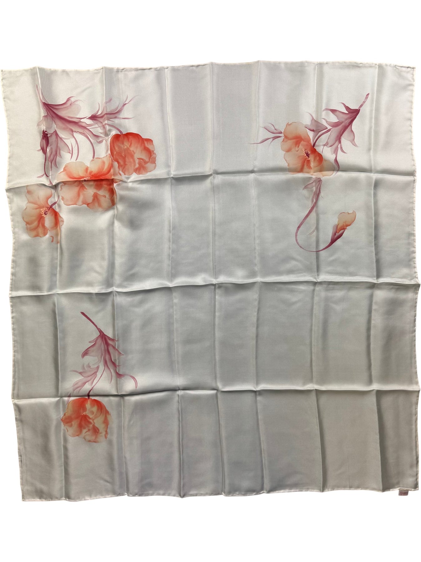 Silk square scarf featuring a floral design. Lightweight and smooth fabric. Brand label: Wako.