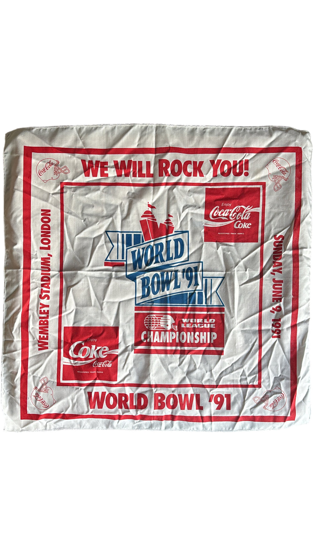 World Bowl '91 towel featuring Coca-Cola branding and championship graphics. Wembley Stadium, London event details included. Red and blue print on white towel.