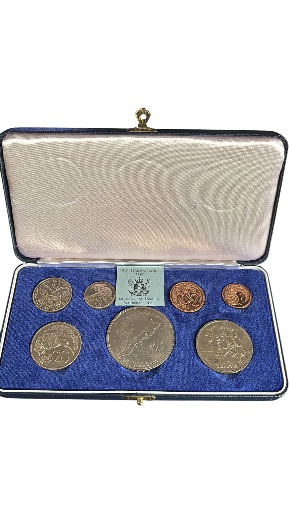 This set includes a collection of polished grade coins issued to commemorate the bi-centenary of James Cook's re-discovery of New Zealand from 1769 to 1969. Made by the Royal Australian Mint, the set is housed in an elegant case.