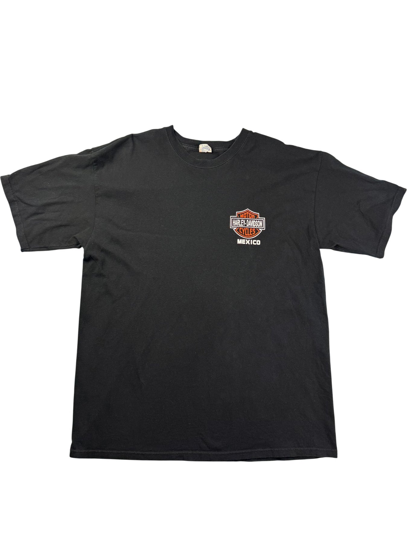 Black T-shirt featuring Harley Davidson logo on the front and back. Made by Yazbek, heavy weight fabric. Made in Mexico.