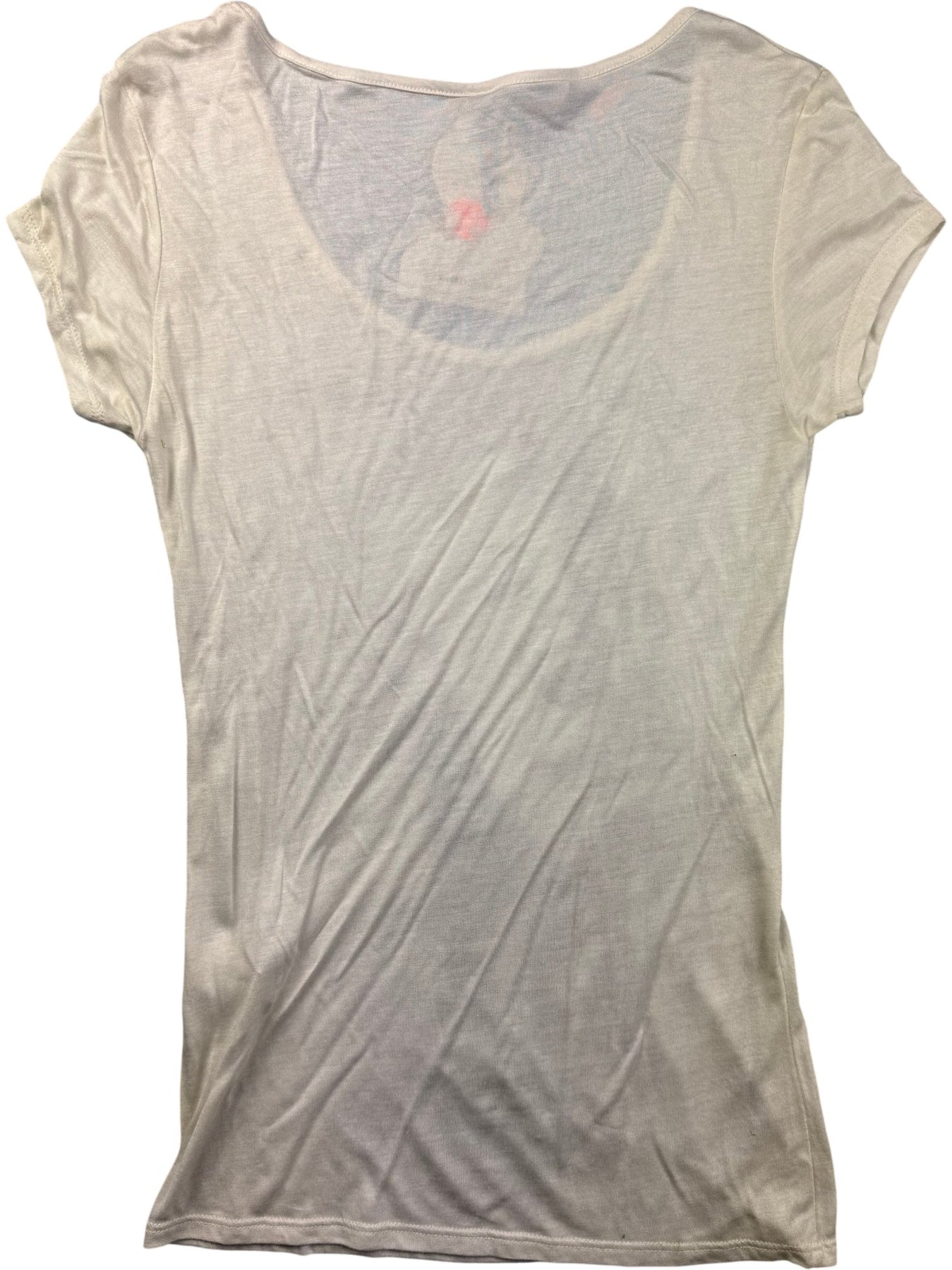White T-shirt featuring a black and white graphic of Marilyn Monroe. Made from 100% rayon, providing a soft and lightweight feel. Crew neckline and short sleeves.