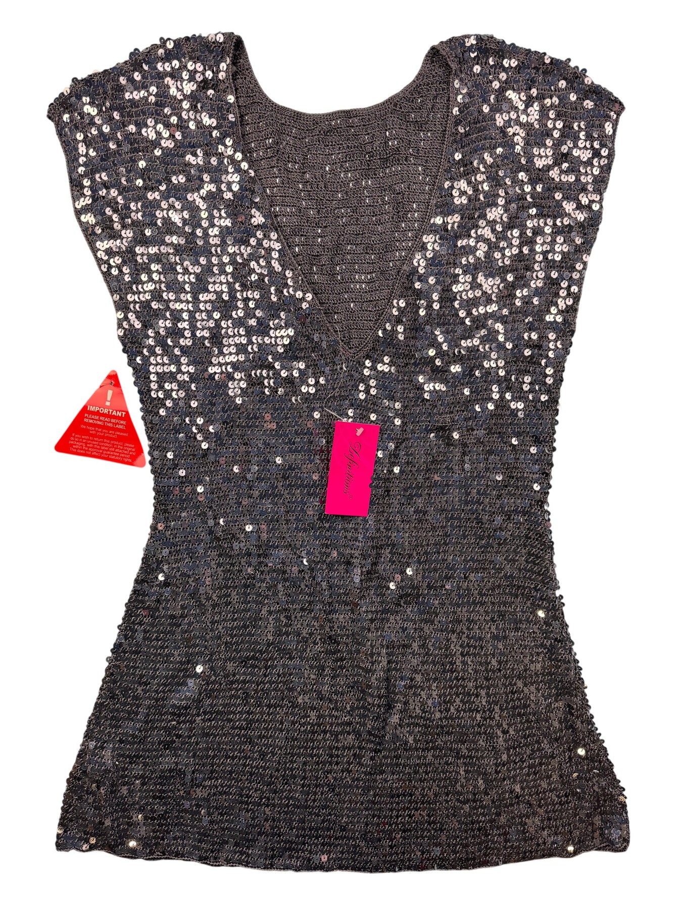 Sleeveless knit top with all-over sequin embellishments. Features a deep V-neckline and fitted silhouette. Made from a blend of synthetic fabrics for added stretch and comfort.