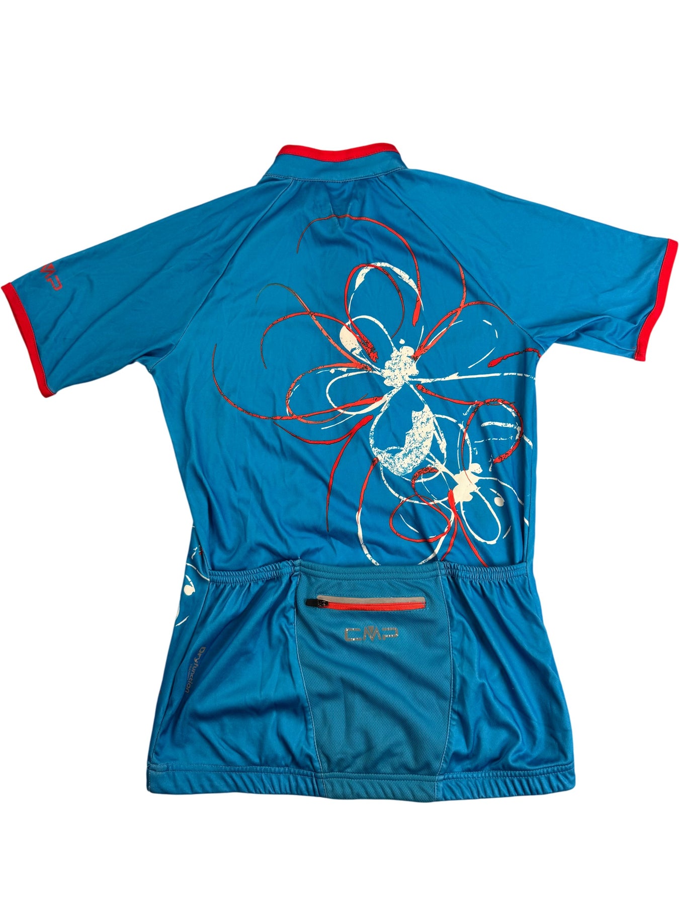 Blue short-sleeved cycling jersey with graphic design and red trim. Features a front zipper, back pocket with zipper, and moisture-wicking fabric.