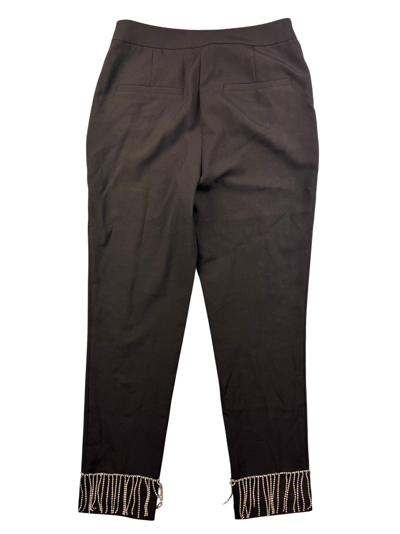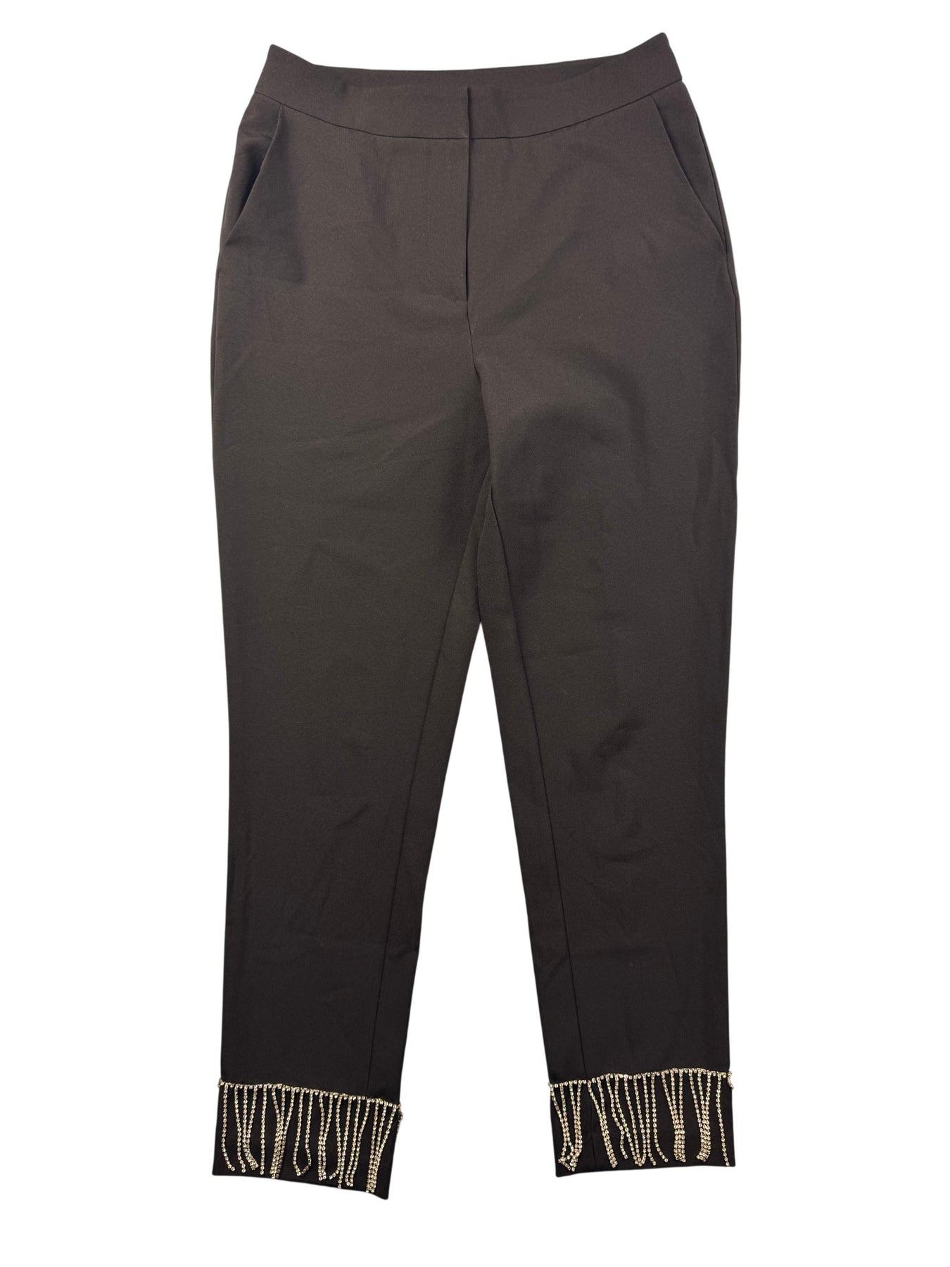 Tailored trousers with beaded hem detailing. Features a sleek design with side pockets and back faux pockets. Made from a smooth fabric for a polished finish.